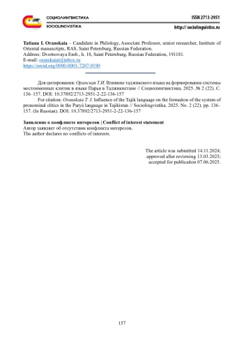 В статье рассматривается формирование системы местоименных клитик (МК) в малом индоарийском языке парья́ как результат взаимодействия собственной парийской модели c таджикской / дари в условиях длительного двуязычия носителей парья. Сопоставление позиций и форм местоименных показателей посессивности в парья ведёт к заключению, что по аналогии с его единственной исконной МК 3-го л. (=so м. р.) используются притяжательные местоимения 1-го и 2-го л., фонетически редуцированные в постпозиции к определяемому. Между их препозитивными и постпозитивными формами существует то же функциональное различие, что и между обозначением принадлежности при посессоре 3-го л.: препозитивное обозначение обладания выражает новую информацию, тогда как МК служит выражению известной информации о посессивном отношении. Можно говорить о формировании в парья системы МК как воспроизводстве функциональной модели МК 3-го л. в 1-м и 2-м л. Её распространение, очевидно, стимулировано шестичленной системой МК таджикского и дари языков, с которыми парья на протяжении нескольких столетий существует, при полном двуязычии, в условиях диглоссии в роли низкого языка.