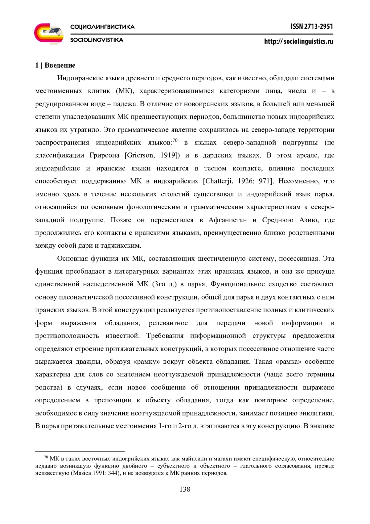 Индоиранские языки древнего и среднего периодов, как известно, обладали системами местоименных клитик (МК), характеризовавшимися категориями лица, числа и – в редуцированном виде – падежа. В отличие от новоиранских языков, в большей или меньшей степени унаследовавших МК предшествующих периодов, большинство новых индоарийских языков их утратило. Это грамматическое явление сохранилось на северо-западе территории распространения индоарийских языков:70 в языках северо-западной подгруппы (по классификации Грирсона [Grierson, 1919]) и в дардских языках.