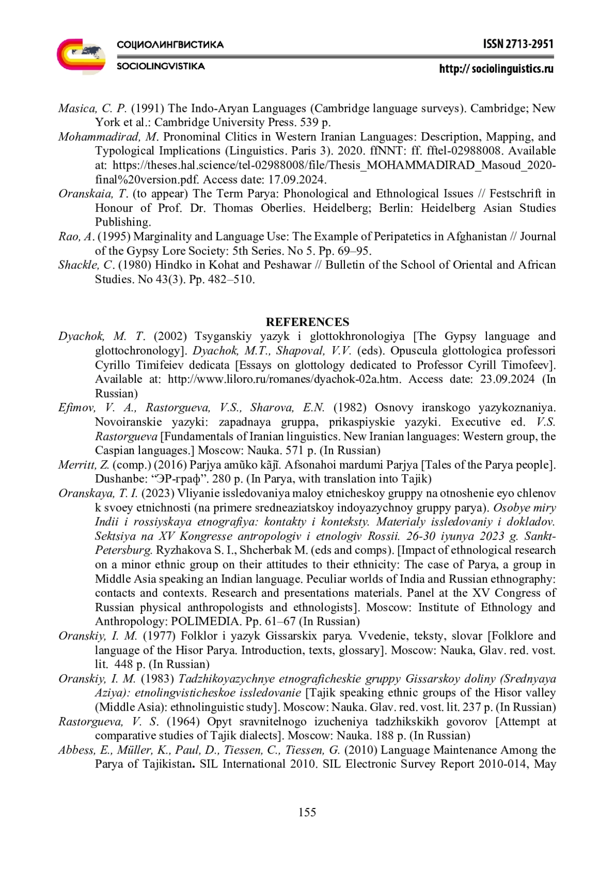 5. Оранский И.М. (1977) Фольклор и язык Гиссарских парья (Средняя Азия). Введение, тексты, словарь. Москва, “Наука”. Глав. ред. вост. лит. 448 с.