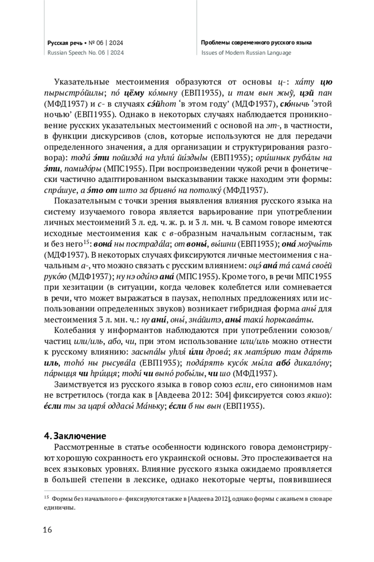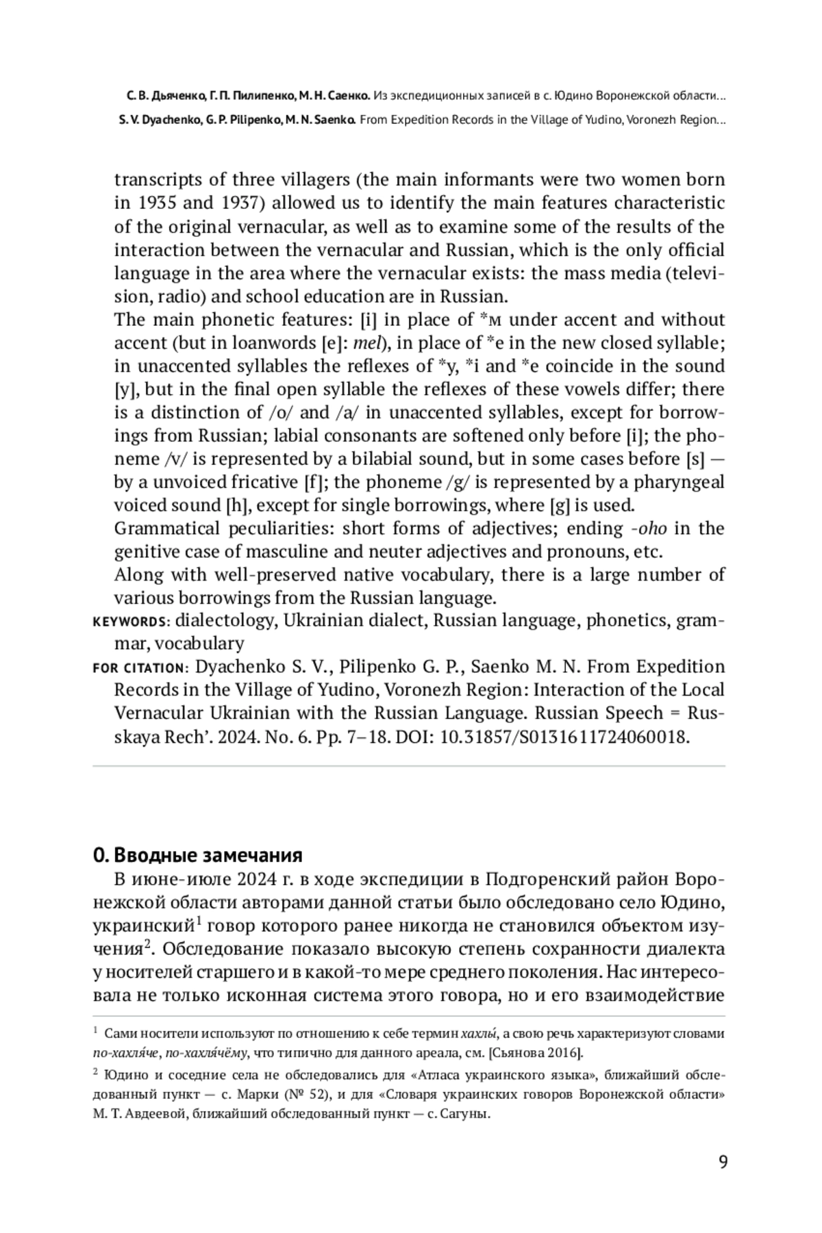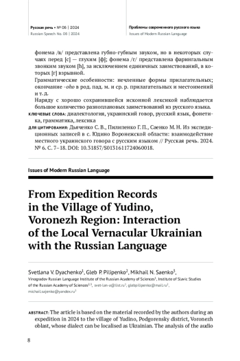 Статья основана на материале, записанном авторами в экспедиции 2024 г. в село Юдино Подгоренского района Воронежской области, говор которого можно локализовать как украинский. Анализ расшифровки аудиозаписей трех жительниц села (главными информантами явились две женщины 1935 и 1937 гг. р.) позволил выявить основные черты, характерные для исконного говора, а также рассмотреть некоторые результаты взаимодействия говора с русским языком, который является единственным официальным языком на территории существования говора: СМИ (телевидение, радио) и обучение в школе на русском языке. Основные фонетические особенности: [и] на месте *ě под ударением и без ударения (но в заимствованиях [е]: ме́л), на месте *e в новом закрытом слоге; в звуке [ы] в безударных слогах совпадают отражения *ы, *и и *е, однако в конечном открытом слоге они различаются; различение /о/ и /а/ в безударных слогах, за исключением заимствований из русского; губные согласные смягчаются только перед [и]; фонема /в/ представлена губно-губным звуком, но в некоторых случаях перед [с] — глухим [ф]; фонема /г/ представлена фарингальным звонким звуком [h], за исключением единичных заимствований, в которых [г] взрывной. Грамматические особенности: нечленные формы прилагательных; окончание -оhо в род. пад. м. и ср. р. прилагательных и местоимений и т. д. Наряду с хорошо сохранившейся исконной лексикой наблюдается большое количество разноплановых заимствований из русского языка