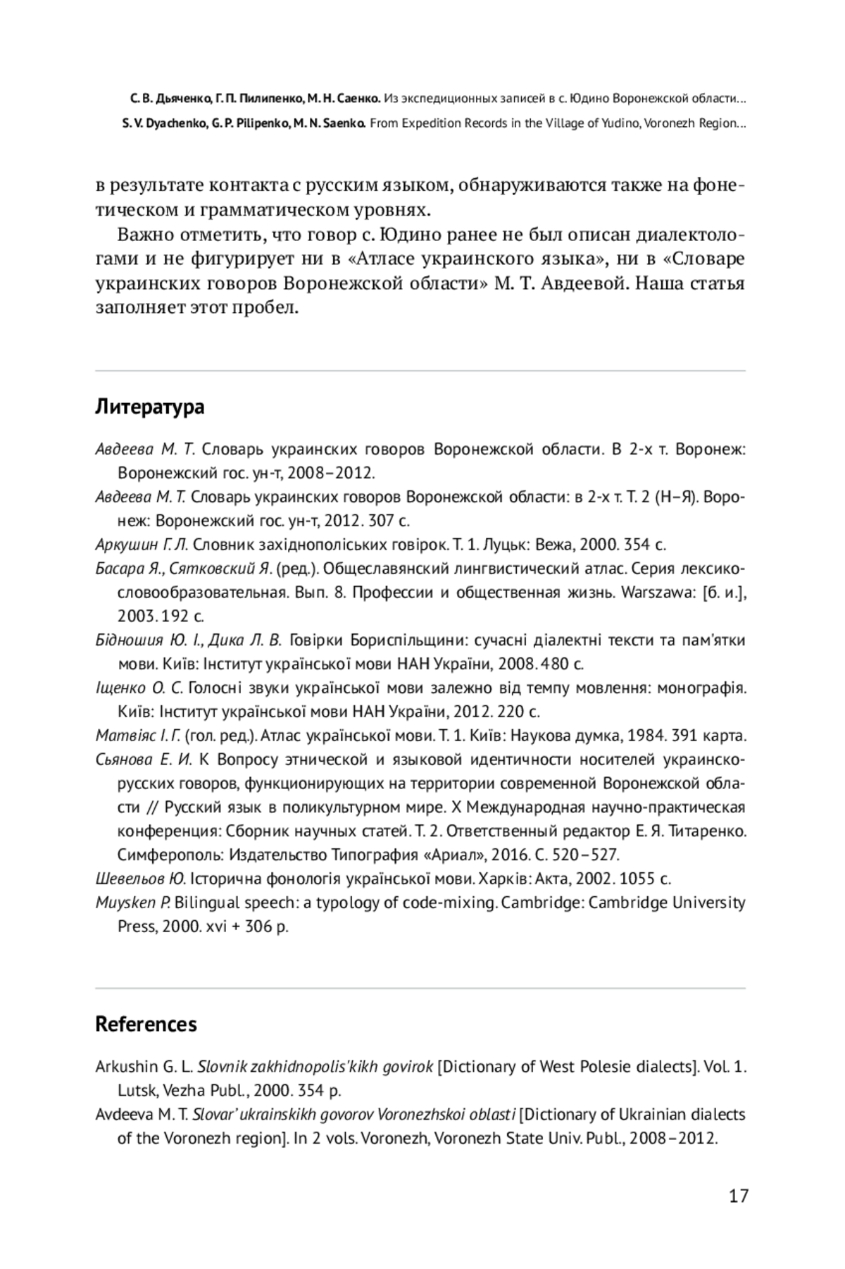 S’yanova E. I. [On the issue of ethnic and linguistic identity of speakers of Ukrainian-Russian dialects functioning in the territory of the modern Voronezh Region]. Russkii yazyk v polikul’turnom mire. X Mezhdunarodnaya nauchno-prakticheskaya konferentsiya: Sbornik nauchnykh statei. Vol. 2. Simferopol, “Arial” Printing House Publ., 2016, pp. 520-527. (In Russ.).