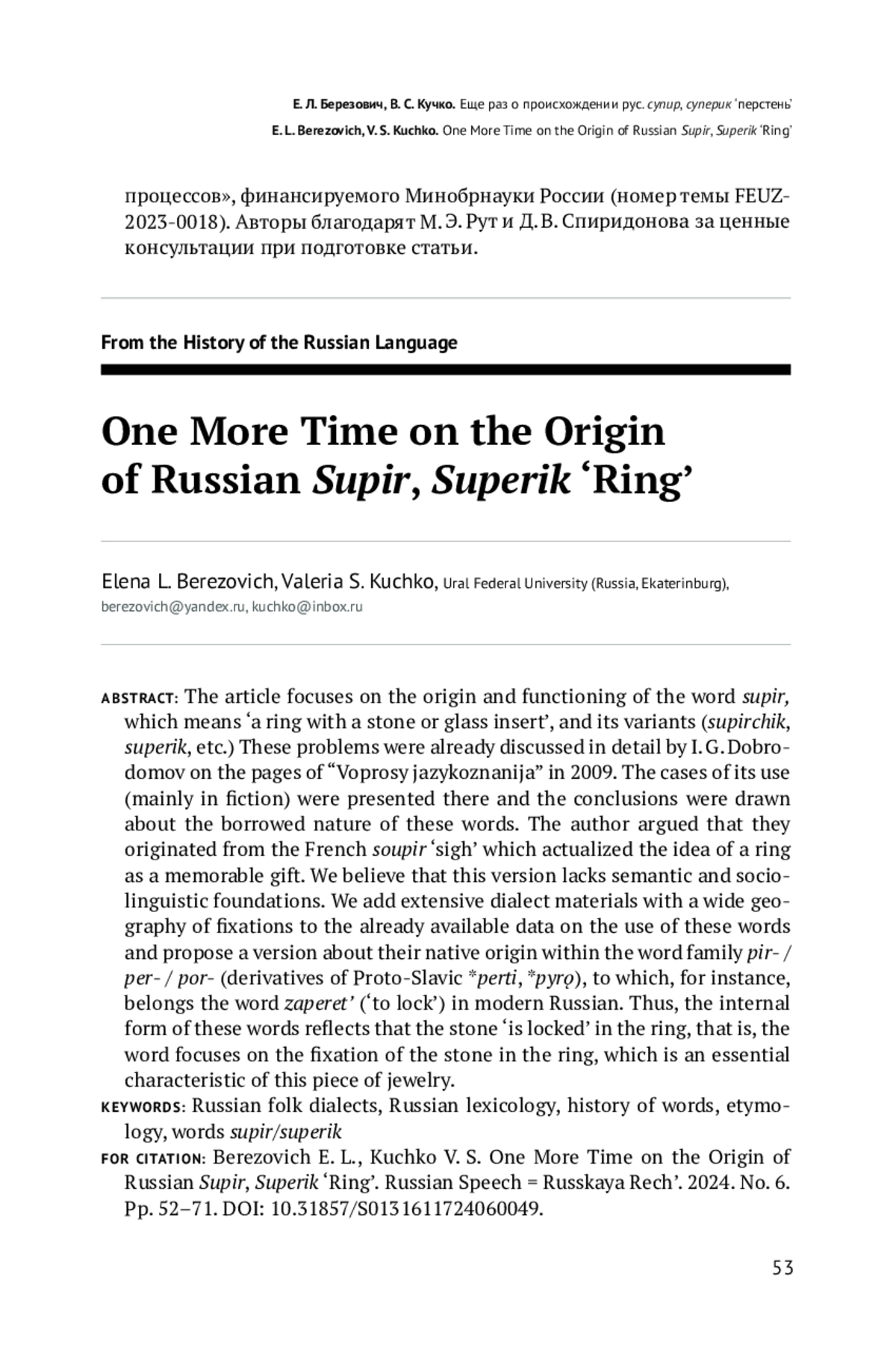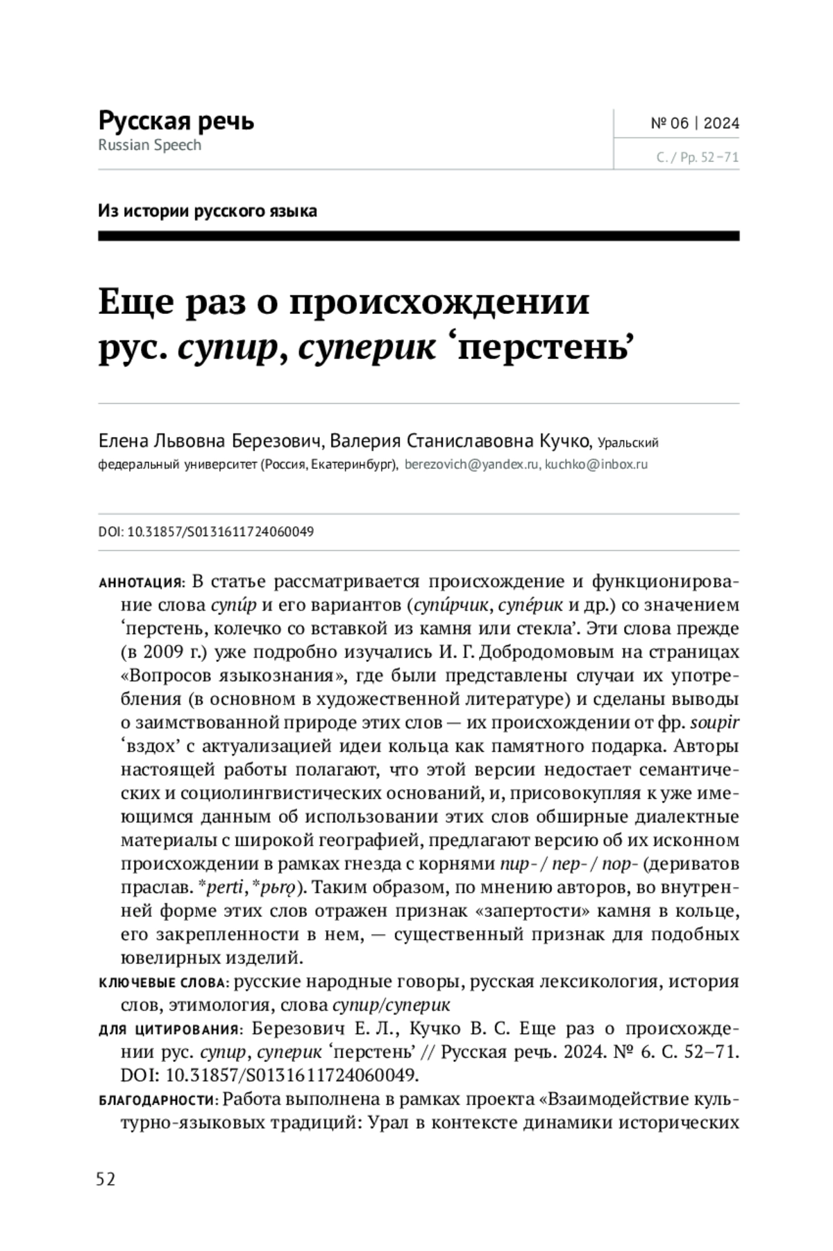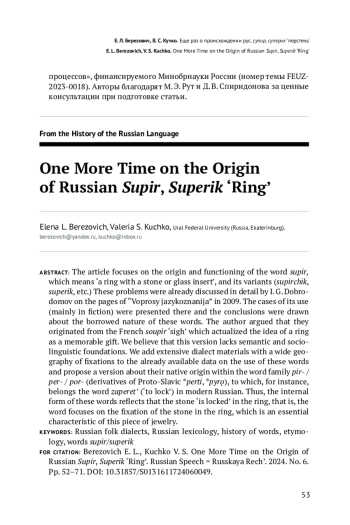 В статье рассматривается происхождение и функционирование слова супúр и его вариантов (супúрчик, супéрик и др.) со значением ‘перстень, колечко со вставкой из камня или стекла’. Эти слова прежде (в 2009 г.) уже подробно изучались И. Г. Добродомовым на страницах «Вопросов языкознания», где были представлены случаи их употребления (в основном в художественной литературе) и сделаны выводы о заимствованной природе этих слов — их происхождении от фр. soupir ‘вздох’ с актуализацией идеи кольца как памятного подарка. Авторы настоящей работы полагают, что этой версии недостает семантических и социолингвистических оснований, и, присовокупляя к уже имеющимся данным об использовании этих слов обширные диалектные материалы с широкой географией, предлагают версию об их исконном происхождении в рамках гнезда с корнями пир- / пер- / пор- (дериватов праслав. *perti, *pьrǫ). Таким образом, по мнению авторов, во внутренней форме этих слов отражен признак «запертости» камня в кольце, его закрепленности в нем, — существенный признак для подобных ювелирных изделий