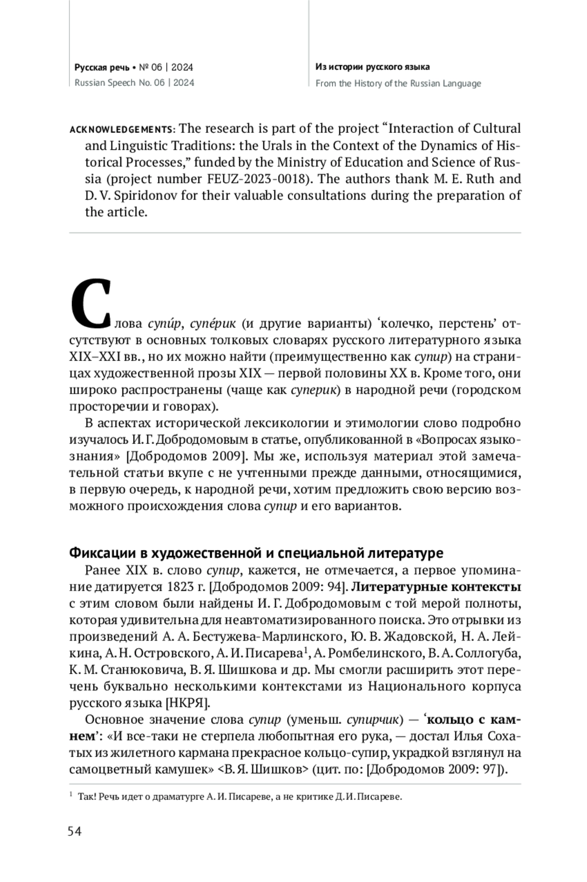 Слова супúр, супéрик (и другие варианты) ‘колечко, перстень’ отсутствуют в основных толковых словарях русского литературного языка XIX–XXI вв., но их можно найти (преимущественно как супир) на страницах художественной прозы XIX — первой половины ХХ в. Кроме того, они широко распространены (чаще как суперик) в народной речи (городском просторечии и говорах). В аспектах исторической лексикологии и этимологии слово подробно изучалось И. Г. Добродомовым в статье, опубликованной в «Вопросах языкознания» [Добродомов 2009]. Мы же, используя материал этой замечательной статьи вкупе с не учтенными прежде данными, относящимися, в первую очередь, к народной речи, хотим предложить свою версию возможного происхождения слова супир и его вариантов.