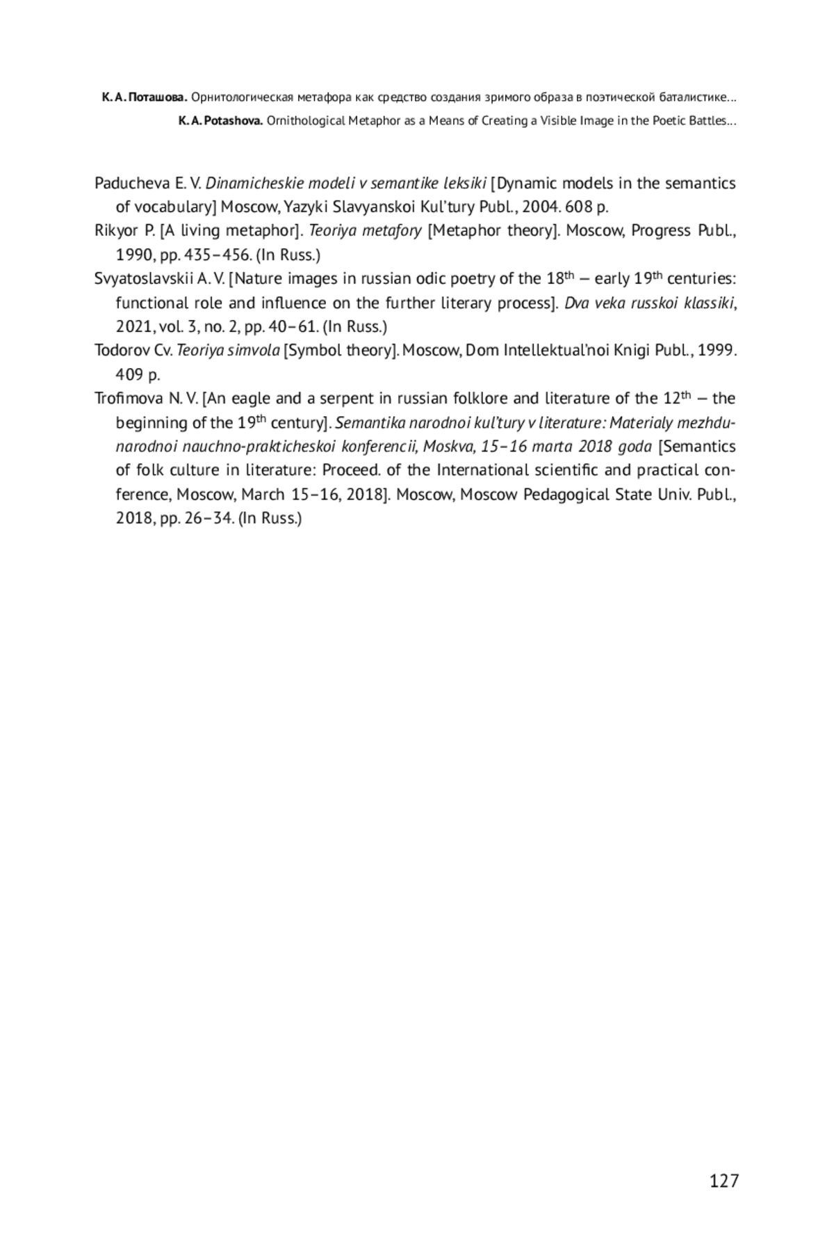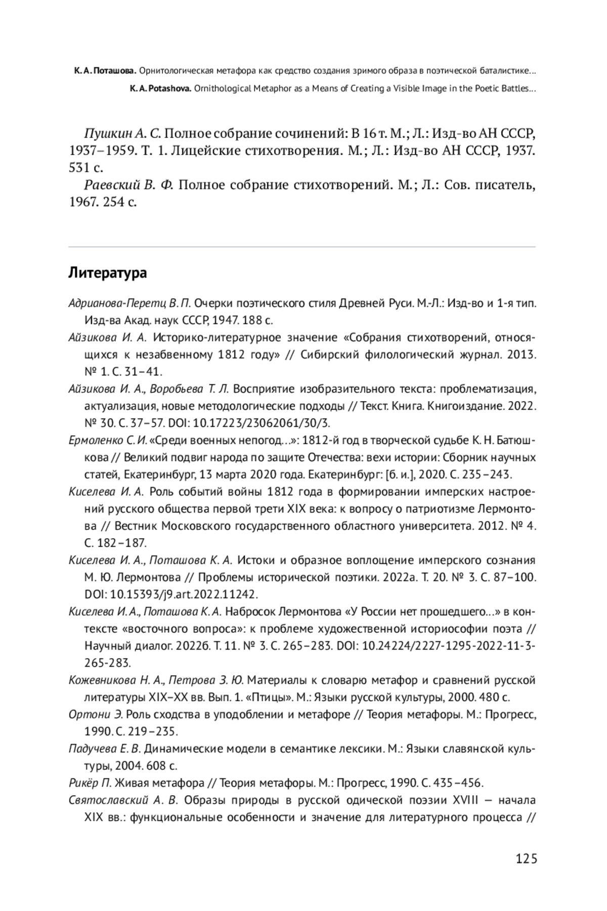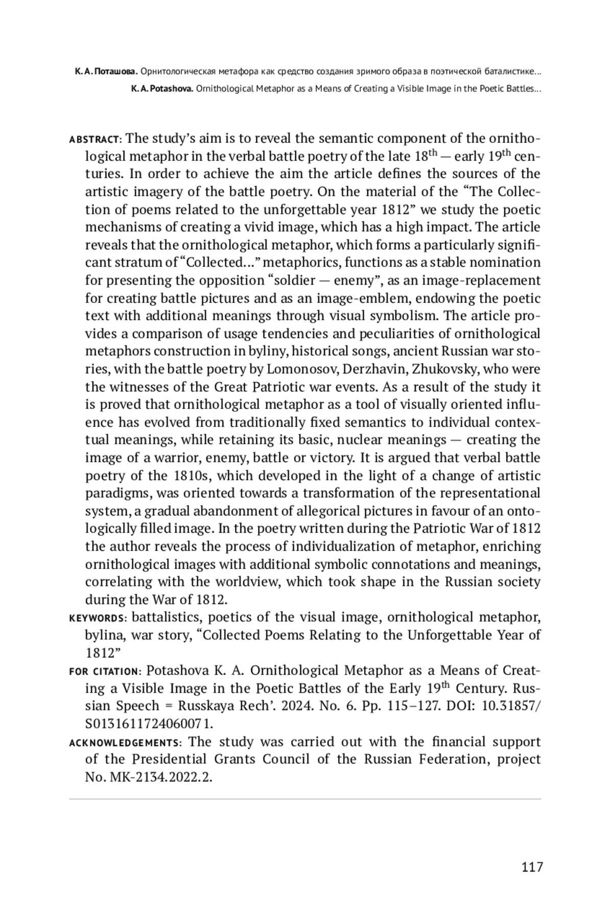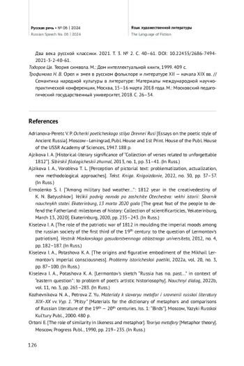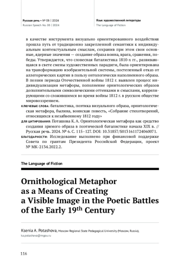 Целью исследования является выявление смысловой составляющей орнитологической метафоры в словесной баталистике конца XVIII — начала XIX в. Для достижения поставленной цели в статье определяются источники художественной образности батальной поэзии, на материале «Собрания стихотворений, относящихся к незабвенному 1812 году» раскрываются поэтические механизмы создания объемного образа, обладающего высокой силой воздействия. Установлено, что орнитологическая метафора, образующая особо значимый пласт метафорики «Собрания…», функционирует как устойчивая номинация для представления оппозиции «воин — враг», как образ-замена для создания батальных картин и как образ-эмблема, наделяющая поэтический текст через визуальную символику дополнительными смыслами. В статье проводится сопоставление тенденций использования и особенностей конструирования орнитологической метафоры в былинах, исторических песнях, древнерусской воинской повести с батальной поэзией М. В. Ломоносова, Г. Р. Державина, В. А. Жуковского, поэтов-очевидцев событий Отечественной войны. В результате проведенного исследования доказано, что орнитологическая метафора в качестве инструмента визуально ориентированного воздействия прошла путь от традиционно закрепленной семантики к индивидуальным контекстуальным смыслам, сохранив при этом свои основные, ядерные значения — создание образа воина, врага, сражения, победы. Утверждается, что словесная баталистика 1810-х гг., развивающаяся в свете смены художественных парадигм, была ориентирована на трансформацию изобразительной системы, постепенный отказ от аллегорических картин в пользу онтологически наполненного образа. В поэзии периода Отечественной войны 1812 г. выявлен процесс индивидуализации метафоры, пополнение орнитологических образов дополнительными символическими оттенками и смыслами, коррелирующими со сложившимся во время войны 1812 г. в русском обществе мировоззрением.