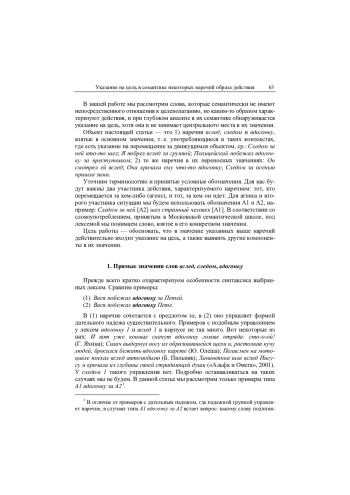Статья посвящена анализу семантики наречий следом, вслед, вдогонку, которые в прямом значении указывают на перемещение за движущимся объектом. В работе демонстрируется, что в семантику выбранных наречий входит указание на цель. Тем не менее данные наречия обычно не включаются в класс целевых наречий. Однако смысл ‘цель’ является фундаментальным для естественного языка, и можно ожидать, что он входит в семантику не только собственно целевых слов. Анализ выбранных слов подтверждает эту гипотезу