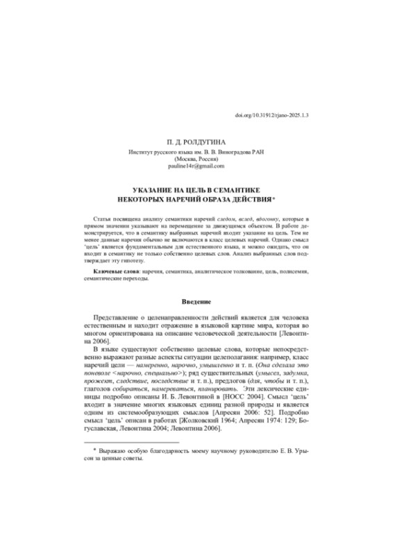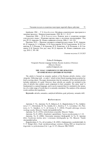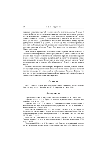 9. Левонтина 2006 - И. Б. Левонтина. Понятие цели и семантика целевых слов русского языка // Языковая картина мира и системная лексикография / Под ред. Ю. Д. Апресяна. М.: Языки славянских культур, 2006. С. 163-238. EDN: REUHEH