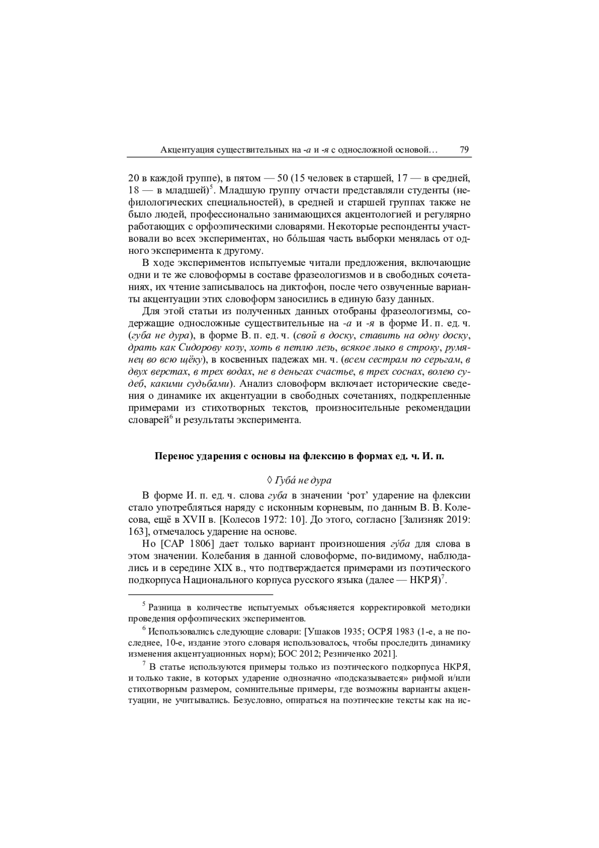 В формах существительных на -а и -я на протяжении веков проходят изменения в акцентуации, которые, по мнению В. Н. Сидорова 1, ведут к противопоставлению форм ед. и мн. ч. [Воронцова 1979: 16]. Об этих процессах на разном материале написано множество работ, см., например, [Колесов 1972; Воронцова 1979; Зализняк 2002; Антонова 2021 и др.]. В этой статье рассматривается акцентуация некоторых существительных на -а и -я в свободных сочетаниях и в составе фразеологизмов 2.