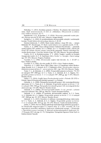 19. Зализняк 2000 - А. А. Зализняк. Палеография берестяных грамот и их внестратиграфическое датирование // В. Л. Янин, А. А. Зализняк. Новгородские грамоты на бересте. Т. X: Из раскопок 1990-1996 гг. Палеография берестяных грамот и их внестратиграфическое датирование. М.: Русские словари, 2000. С. 134-429.