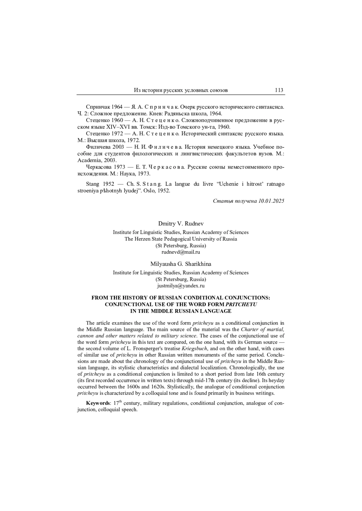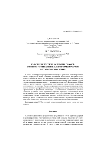 В статье анализируется употребление словоформы притчею в качестве условного союза в старорусском языке. Основным источником исследования послужил «Устав ратных, пушечных и других дел, касающихся до воинской науки». Выявленные в данном тексте случаи союзного употребления словоформы притчею сопоставлены, с одной стороны, с их немецким источником — вторым томом трактата Л. Фронспергера «Kriegsbuch», а с другой стороны, — со сходными конструкциями в иных русских письменных памятниках того же периода. На основе проведенного анализа сделаны выводы о хронологии союзного употребления притчею в старорусском языке, его стилистической характеристике и диалектной локализации. Хронологически употребление притчею в качестве условного союза ограничено коротким периодом, охватывающим конец XVI в. (первые случаи фиксации в письменных текстах) — середину XVII в. (выход из употребления). Расцвет употребления пришелся на 1600–1620-е гг. В стилистическом отношении аналог условного союза притчею характеризуется разговорно-просторечной окраской и фиксируется преимущественно в памятниках деловой письменности
