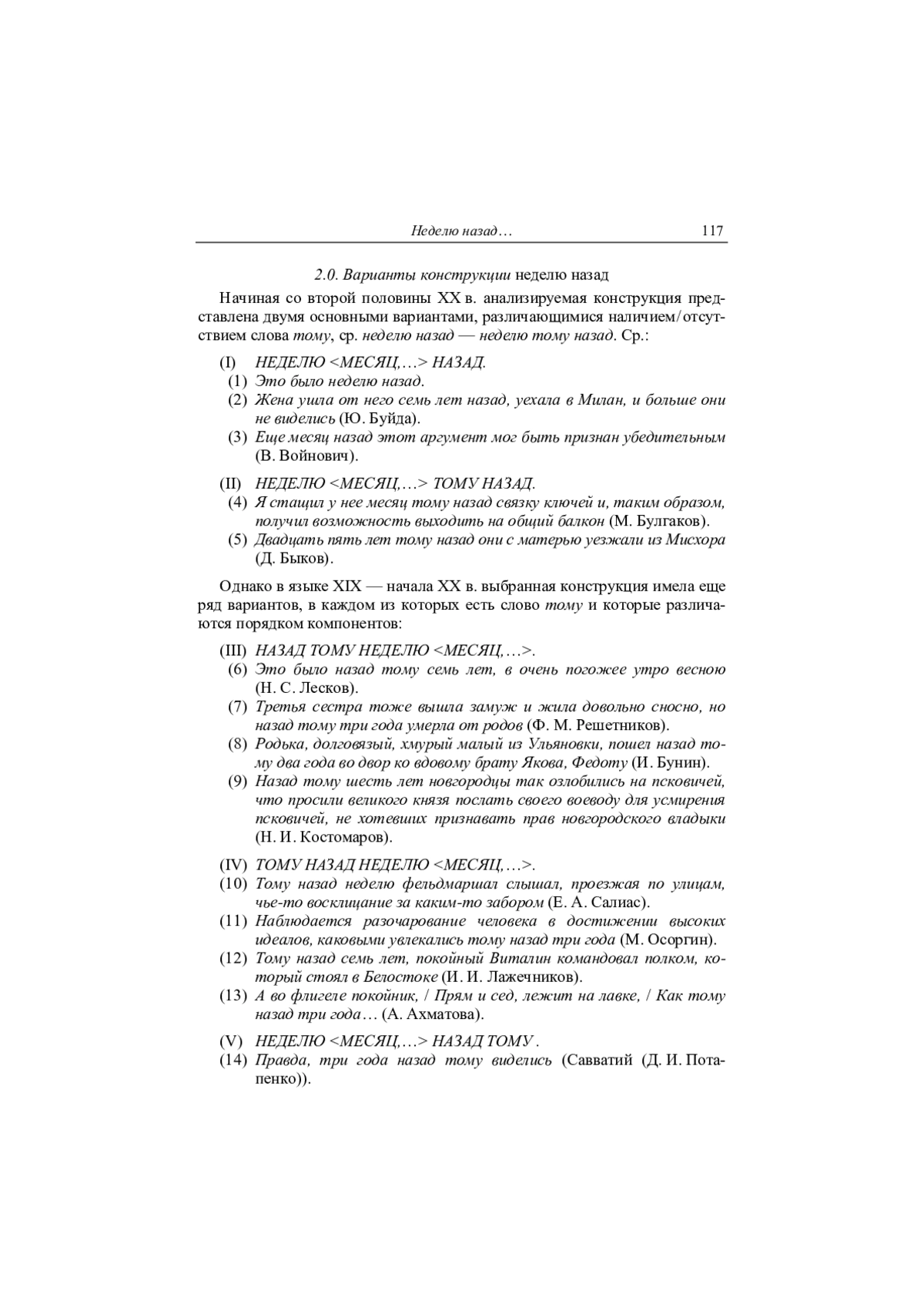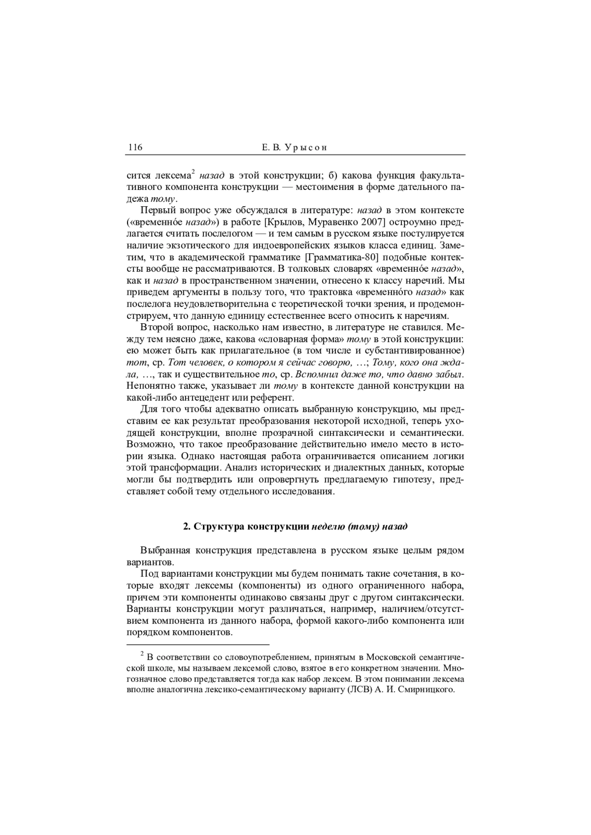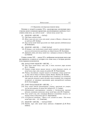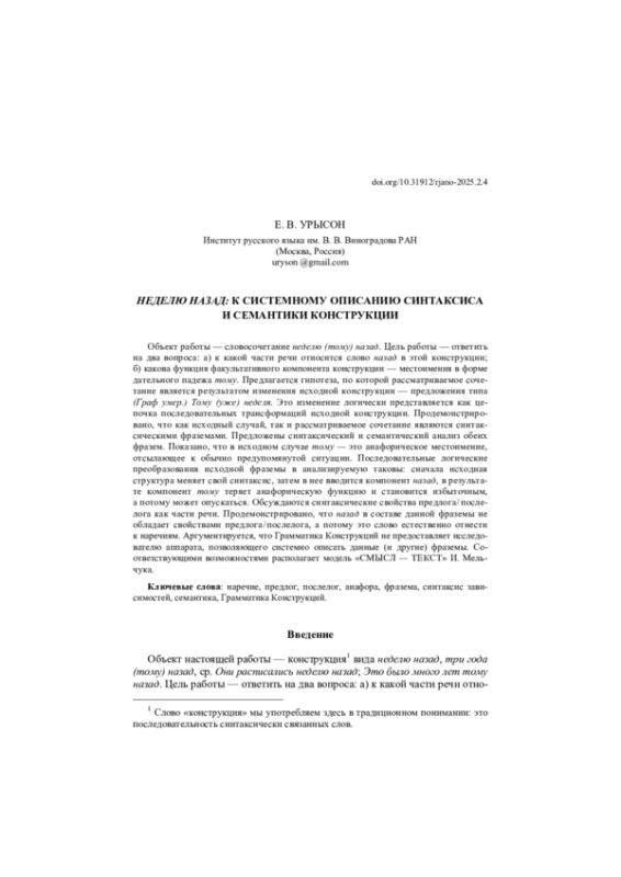 Объект работы — словосочетание неделю (тому) назад. Цель работы — ответить на два вопроса: а) к какой части речи относится слово назад в этой конструкции; б) какова функция факультативного компонента конструкции — местоимения в форме дательного падежа тому. Предлагается гипотеза, по которой рассматриваемое сочетание является результатом изменения исходной конструкции — предложения типа (Граф умер.) Тому (уже) неделя. Это изменение логически представляется как цепочка последовательных трансформаций исходной конструкции. Продемонстрировано, что как исходный случай, так и рассматриваемое сочетание являются синтаксическими фраземами. Предложены синтаксический и семантический анализ обеих фразем. Показано, что в исходном случае тому — это анафорическое местоимение, отсылающее к обычно предупомянутой ситуации. Последовательные логические преобразования исходной фраземы в анализируемую таковы: сначала исходная структура меняет свой синтаксис, затем в нее вводится компонент назад, в результате компонент тому теряет анафорическую функцию и становится избыточным, а потому может опускаться. Обсуждаются синтаксические свойства предлога / послелога как части речи. Продемонстрировано, что назад в составе данной фраземы не обладает свойствами предлога / послелога, а потому это слово естественно отнести к наречиям. Аргументируется, что Грамматика Конструкций не предоставляет исследователю аппарата, позволяющего системно описать данные (и другие) фраземы. Соответствующими возможностями располагает модель «СМЫСЛ — ТЕКСТ» И. Мельчука