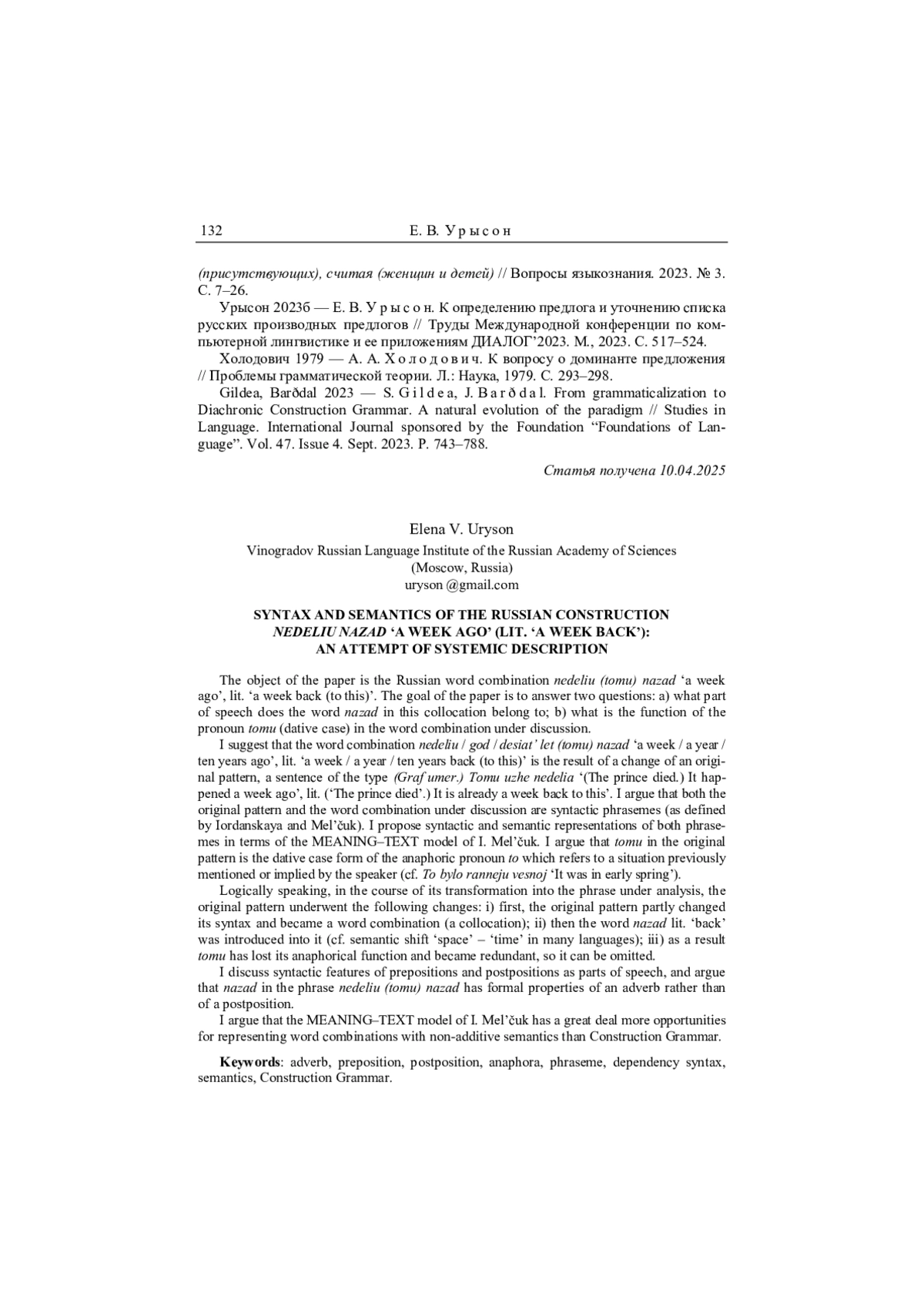 21. Gildea, Barðdal 2023 - S. Gildea, J. Barðdal. From grammaticalization to Diachronic Construction Grammar. A natural evolution of the paradigm // Studies in Language.International Journal sponsored by the Foundation “Foundations of Language”. Vol. 47. Issue 4. Sept. 2023. P. 743-788. EDN: CLEOJT