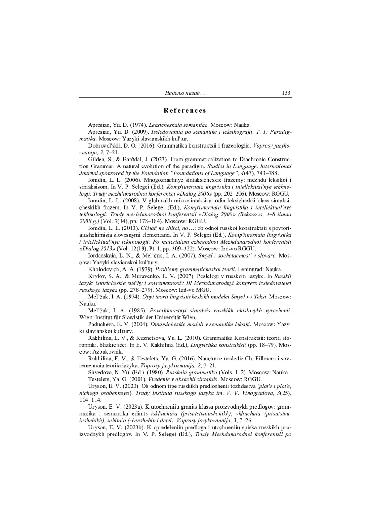 18. Урысон 2023а - Е. В. Урысон. К уточнению границ класса производных предлогов: грамматика и семантика единиц исключая (присутствующих), включая (присутствующих), считая (женщин и детей) // Вопросы языкознания. 2023. № 3. С. 7-26. EDN: MMDJPQ