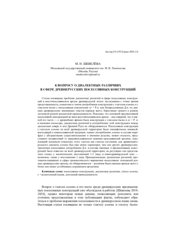 Вопрос о глаголе имѣти и его месте среди древнерусских предикативных посессивных конструкций уже обсуждался в работах [Шевелева 2019; 2024], однако некоторые новые данные, позволяющие дополнить или уточнить представленные в этих публикациях факты, побуждают обратиться к проблеме выражения посессивности в древнерусском языке снова. Настоящая статья посвящена не только глаголу имѣти и статусу бытии имѣти-конструкций обладания в древнерусском языке по данным некнижных текстов, но и способам выражения посессора с помощью Р. п. или Д. п. и проблеме посессивного дательного в древнерусском языке, традиционно считающегося маркированно книжным церковнославянизмом. Весь этот комплекс проблем непосредственно связан с вопросом о диалектных различиях в сфере выражения посессивности внутри восточнославянской диалектной зоны древнерусской эпохи.
