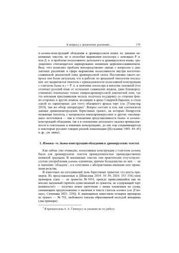 Статья посвящена проблеме диалектных различий в сфере посессивных конструкций в восточнославянском ареале древнерусской эпохи: исследованы с точки зрения представленности, семантики и типов употребления конструкции с глаголом имѣти и с глаголом быти с посессивным показателем оу + Р. п. или беспредложным Д. п. по данным древнерусских некнижных текстов (прежде всего, берестяных грамот) и ранних летописей разной диалектной принадлежности. Показано, что основной предикативной посессивной конструкцией во всем восточнославянском ареале – как северной, так и южной его части — с древнейших времен была конструкция с глаголом быти и оу + Р. п. в значении посессора, диалектных различий в употреблении этой конструкции между диалектами севера и юга Древней Руси не обнаруживается. Посессивная конструкция с глаголом имѣти на всей древнерусской территории была специфически книжной, восходящей к южнославянской традиции, однако употребление имѣти в составе перифраз с абстрактными существительными и именами родства, можно полагать, представляет независимый от церковнославянского влияния праславянский архаизм, отражающий исконную семантику этого глагола как глагола состояния; для древненовгородского диалекта имѣти был еще менее характерен, чем для других древнерусских. Архаичное посессивное употребление Д. п. в составе именных и предикативных конструкций было известно на всей древнерусской территории, но регулярно оно представлено только у энклитических местоимений 1-2 лица, в южнодревнерусской зоне — возможно, также у местоимения 3 лица. Принципиальных диалектных различий, противопоставлявших в сфере грамматического выражения посессивных отношений разные древнерусские ареалы, не обнаруживается – различия были связаны прежде всего с более или менее устойчивым сохранением архаизмов