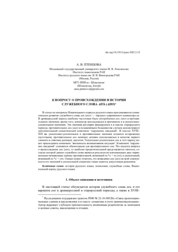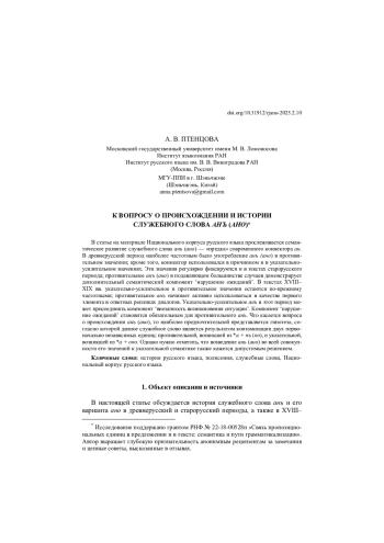 В статье на материале Национального корпуса русского языка прослеживается семантическое развитие служебного слова анъ (ано) — «предка» современного коннектора ан. В древнерусский период наиболее частотным было употребление анъ (ано) в противительном значении; кроме того, коннектор использовался в причинном и в указательноусилительном значениях. Эти значения регулярно фиксируются и в текстах старорусского периода; противительное анъ (ано) в подавляющем большинстве случаев демонстрирует дополнительный семантический компонент ‘нарушение ожиданий’. В текстах XVIII– XIX вв. указательно-усилительное и противительное значения остаются по-прежнему частотными; противительное анъ начинает активно использоваться в качестве первого элемента в ответных репликах диалогов. Указательно-усилительное анъ в этот период может присоединять компонент ‘внезапность возникновения ситуации’. Компонент ‘нарушение ожиданий’ становится обязательным для противительного анъ. Что касается вопроса о происхождении анъ (ано), то наиболее предпочтительной представляется гипотеза, согласно которой данное служебное слово является результатом контаминации двух первоначально независимых единиц: противительной, возникшей из *a + nъ (no), и указательной, возникшей из *a + ono. Однако нужно отметить, что возведение анъ (ано) во всей совокупности его значений к указательной семантике также кажется допустимым решением