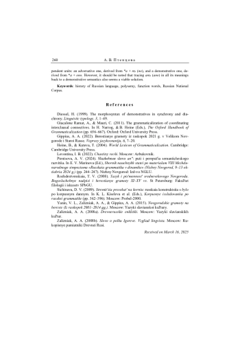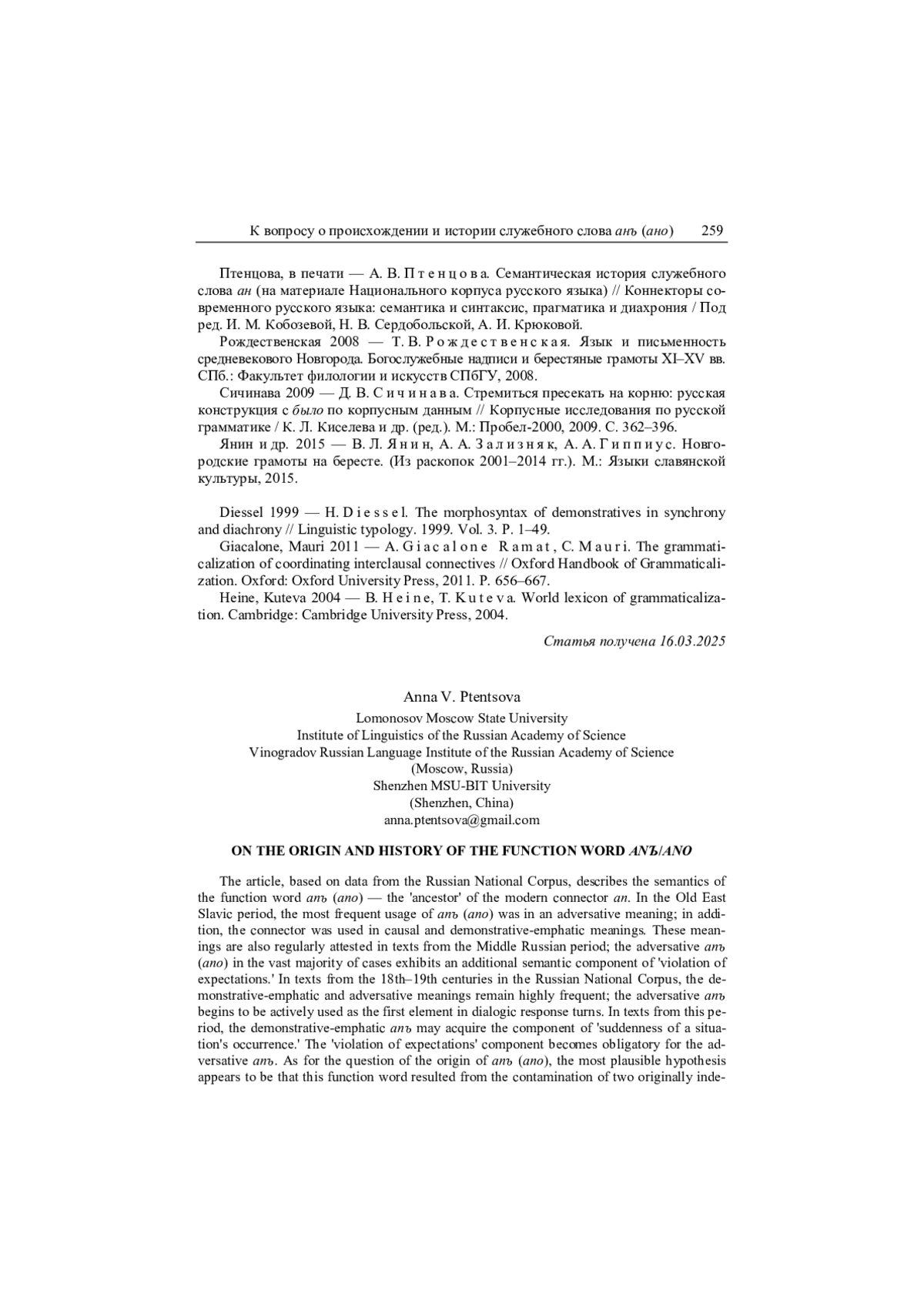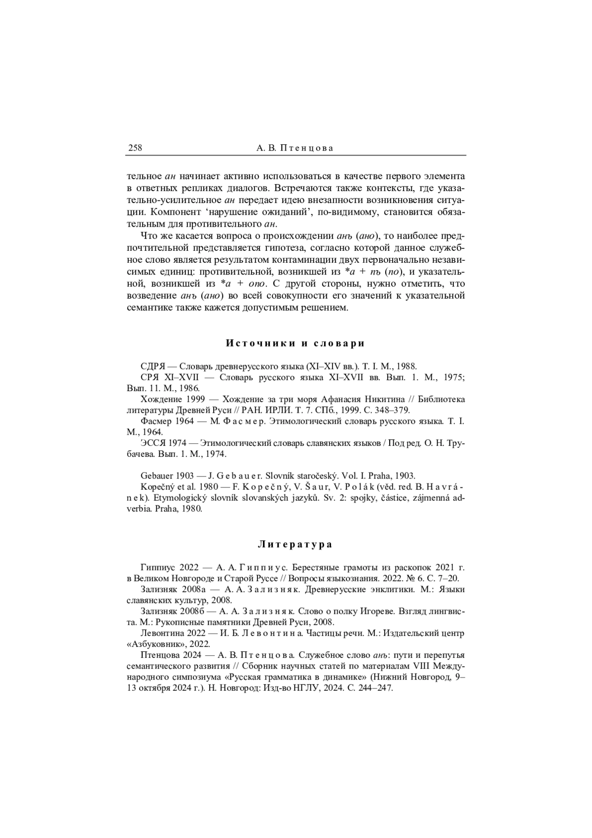 12. Птенцова 2024 - А. В. Птенцова. Служебное слово анъ: пути и перепутья семантического развития // Сборник научных статей по материалам VIII Международного симпозиума “Русская грамматика в динамике” (Нижний Новгород, 9-13 октября 2024 г.). Н. Новгород: Изд-во НГЛУ, 2024. С. 244-247.