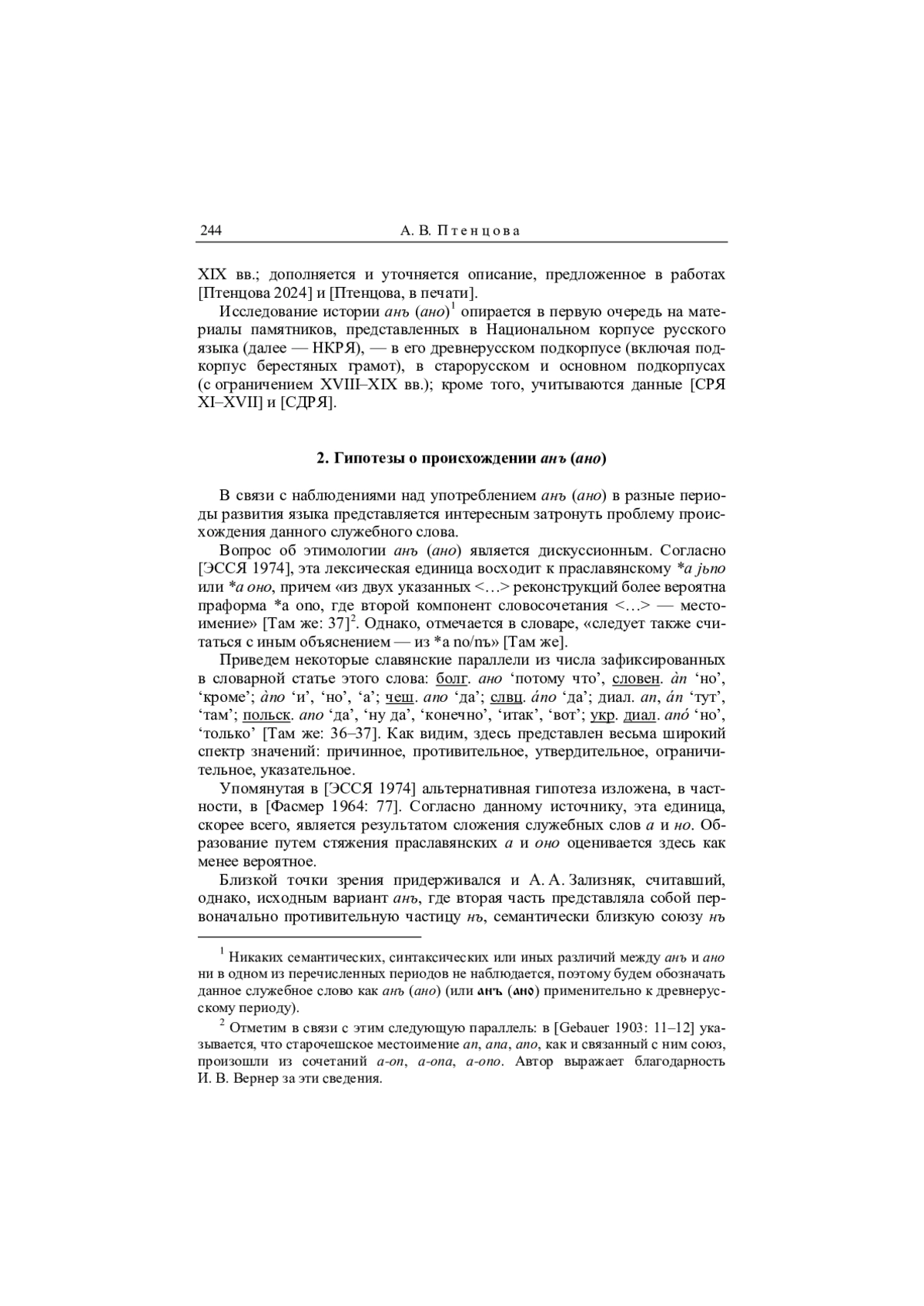 В настоящей статье обсуждается история служебного слова анъ и его варианта ано в древнерусский и старорусский периоды, а также в XVIII–XIX вв.; дополняется и уточняется описание, предложенное в работах [Птенцова 2024] и [Птенцова, в печати]. Исследование истории анъ (ано) 1 опирается в первую очередь на материалы памятников, представленных в Национальном корпусе русского языка (далее — НКРЯ), — в его древнерусском подкорпусе (включая подкорпус берестяных грамот), в старорусском и основном подкорпусах (с ограничением XVIII–XIX вв.); кроме того, учитываются данные [СРЯ XI–XVII] и [СДРЯ].