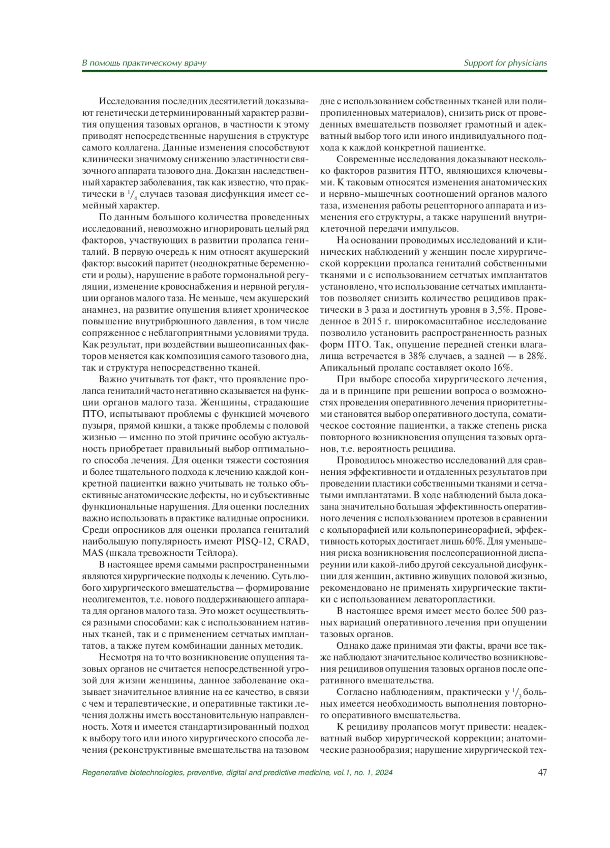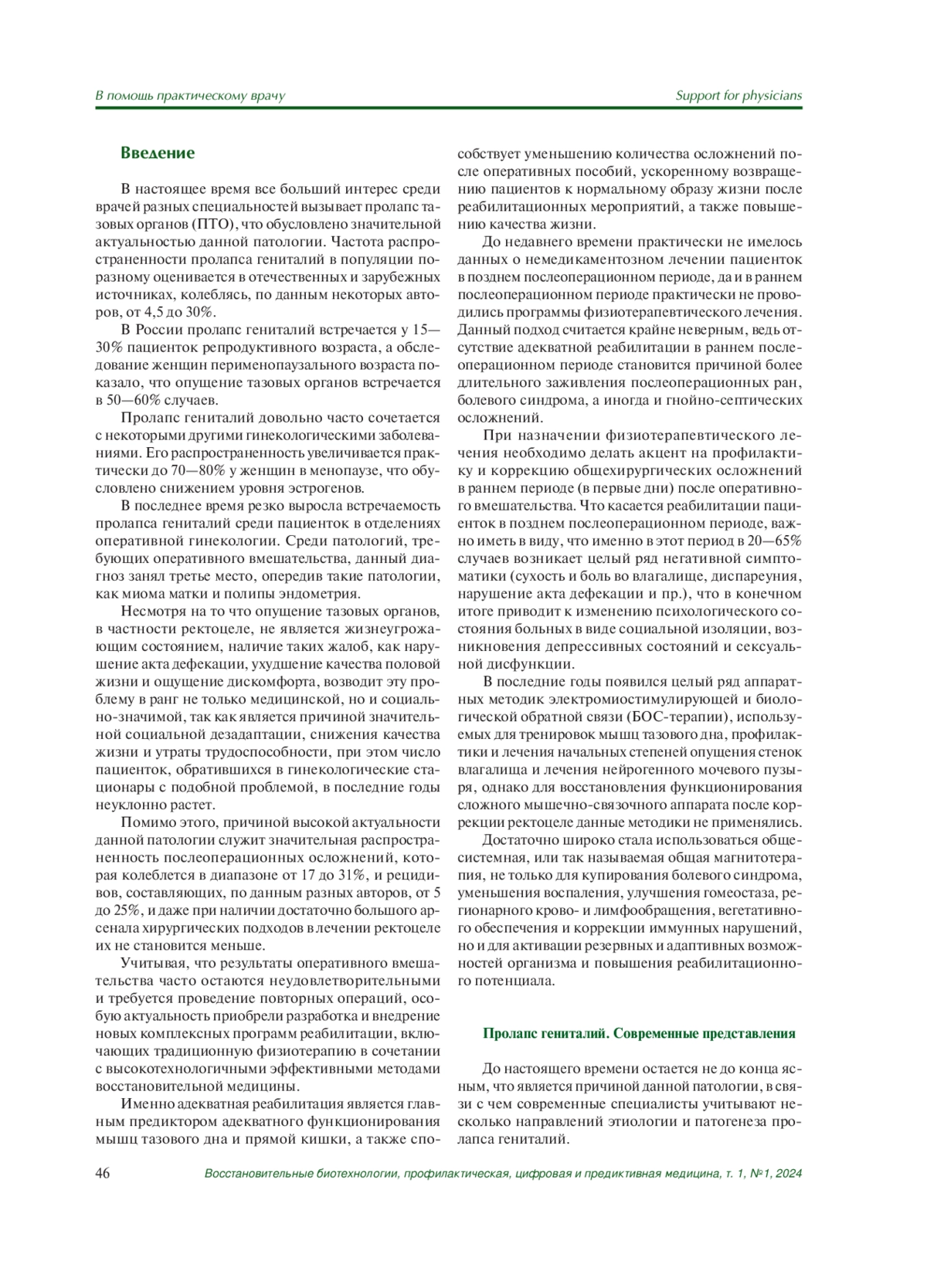 В настоящее время все больший интерес среди врачей разных специальностей вызывает пролапс тазовых органов (ПТО), что обусловлено значительной актуальностью данной патологии. Частота распространенности пролапса гениталий в популяции поразному оценивается в отечественных и зарубежных источниках, колеблясь, по данным некоторых авторов, от 4,5 до 30%.
