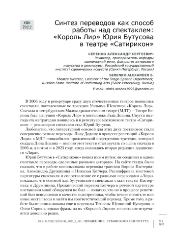 На примере спектакля Юрия Бутусова «Король Лир», поставленного в театре «Сатирикон» в 2006 году, говорится о соединении разных переводов в работе режиссера с текстом пьесы. В процессе репетиций Бутусов и актеры создали текстовую партитуру, компонуя переводы Пастернака, Дружинина, Сороки, Щепкиной-Куперник. Синтез переводов становится прежде всего способом работы с актерами - так обретается уникальная речевая партитура каждого персонажа, наиболее точно соотносящаяся с индивидуальностями актеров.