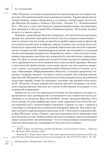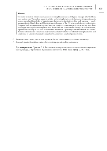 Мир современной культуры вмещает в себя многочисленные философско-религиозные представления и установки, доставшиеся нам по наследству от более древних эпох. Они часто присутствуют в художественных произведениях в имплицитно-герметической форме и требуют от аудитории навыка дешифровки, основанного на специфических знаниях о забытых учениях прошлого. Одно из таких учений, имевших широкое хождение на Ближнем Востоке и в Северной Африке на заре христианской эры, а затем перекинувшееся на европейский средиземноморский регион в виде опасной еретической экзотики, должно, как нам кажется, учитываться любителями осмысленного созерцания произведений искусства особо. В XX-XXI веках через медиадискурс оно проникло фактически во все поры культурной среды - живопись, литературу, театр, кинематограф. Имя ему - гностицизм. Статья посвящена анализу различных схем научной концептуализации и «сертификации» идей гностицизма в условиях перехода человечества в состояние постсовременности.