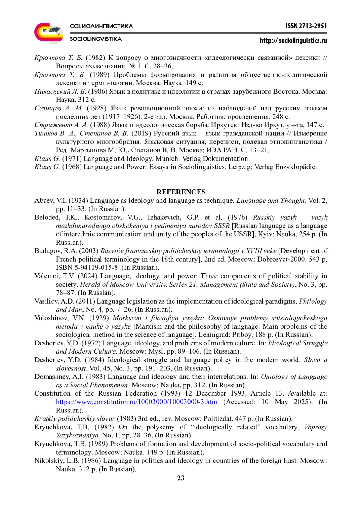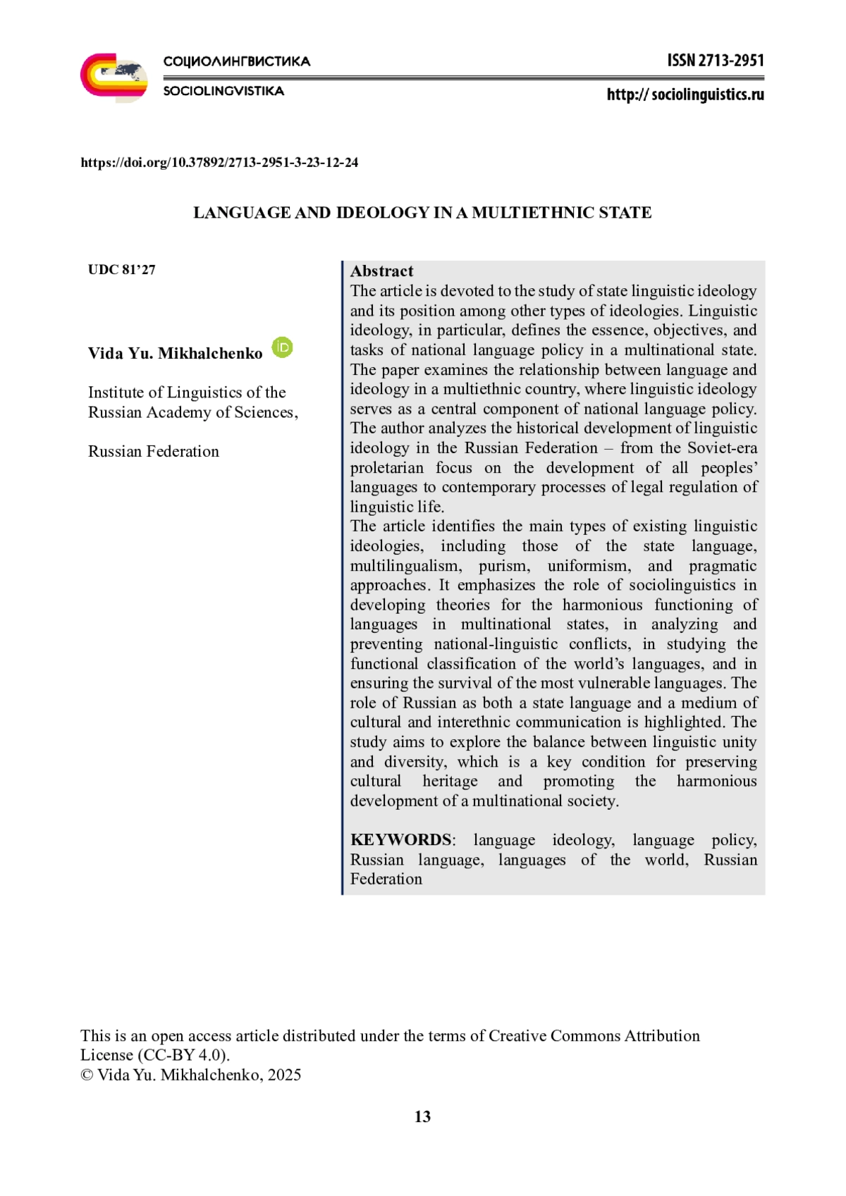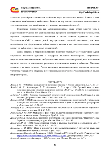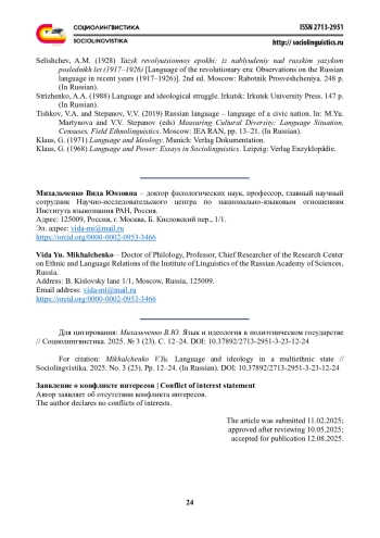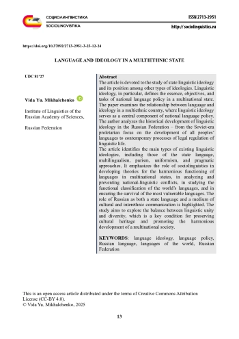 Статья посвящена исследованию языковой государственной идеологии и ее месту среди других типов идеологий. Именно языковая идеология определяет сущность, цели и задачи национально-языковой политики в многонациональной стране. В статье рассматривается соотношение языка и идеологии в полиэтническом государстве, где языковая идеология выступает важнейшим компонентом национально-языковой политики. Автор анализирует историческое развитие языковой идеологии в Российской Федерации - от советского периода пролетарской ориентации на развитие языков всех народов до современных процессов правового регулирования языковой жизни. Раскрываются основные типы существующих языковых идеологий: государственного языка, полиязычия, пуризма, униформизма и прагматического подхода. Подчеркивается роль социальной лингвистики в разработке теории гармоничного функционирования языков в многонациональных странах, анализе и предупреждении национально-языковых конфликтов, изучении функциональной классификации языков мира и обеспечении успешного существования наиболее уязвимых языков. Отмечается роль русского языка как государственного и как средства культурного и межнационального общения. Исследование направлено на осмысление баланса между единством и разнообразием языковой среды, что является ключевым условием сохранения культурного наследия и гармоничного развития многонационального общества.