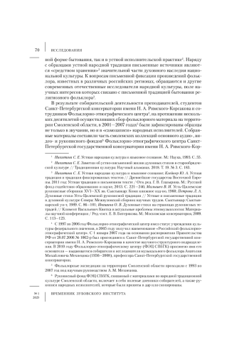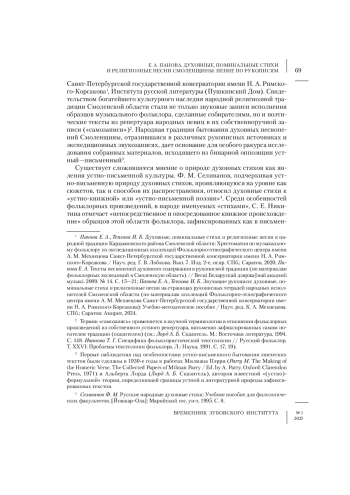 Смоленская область является одной из заповедных зон северо-западной России, притягивающих внимание собирателей и исследователей фольклора, в круг научных интересов которых входили произведения различных жанров, включая образцы религиозной народной традиции. Первые фундаментальные публикации музыкально-этнографических материалов, записанных на этой территории в XIX веке, связаны с именами П. А. Бессонова1, Е. Р. Романова2, В. Н. Добровольского3, в работах которых собран основной корпус фольклорных текстов духовного содержания северо-западной территории. Высокую сохранность образцов народной музыкальной традиции, зафиксированных на Смоленщине на рубеже XX—XXI столетий, демонстрируют результаты работы фольклорных экспедиций ведущих научных и учебных организаций — Академии музыки имени Гнесиных4, Санкт-Петербургской государственной консерватории имени Н. А. Римского-Корсакова1, Института русской литературы (Пушкинский Дом). Свидетельством богатейшего культурного наследия народной религиозной традиции Смоленской области стали не только звуковые записи исполнения образцов музыкального фольклора, сделанные собирателями, но и поэтические тексты из репертуара народных певиц в их собственноручной записи («самозаписи»)2. Народная традиция бытования духовных песнопений Смоленщины, отразившаяся в различных рукописных источниках и экспедиционных звукозаписях, дает основание для особого ракурса исследования собранных материалов, исходящего из бинарной оппозиции устный—письменный3.