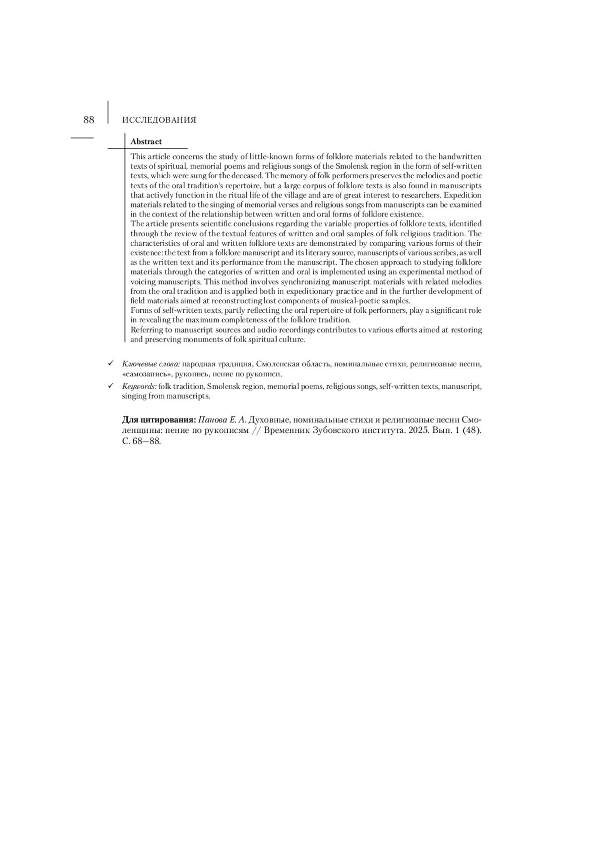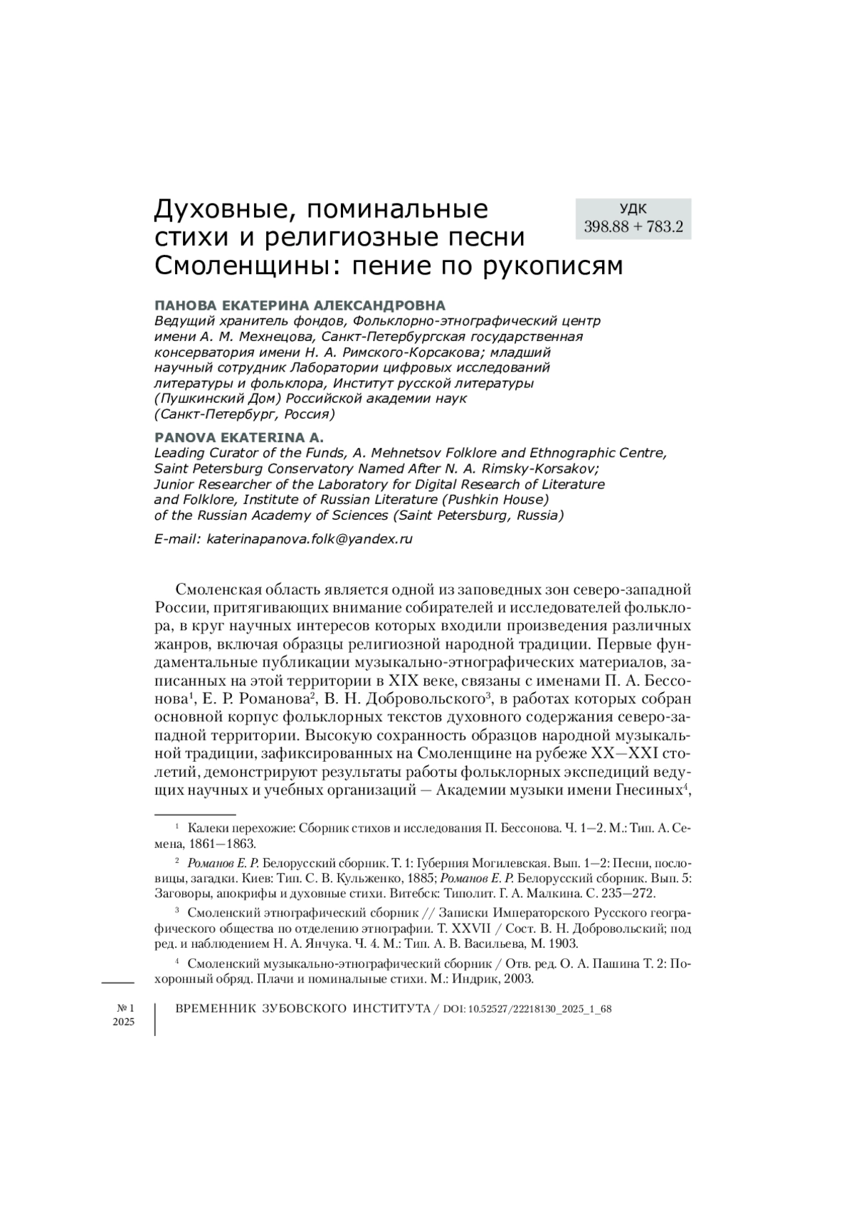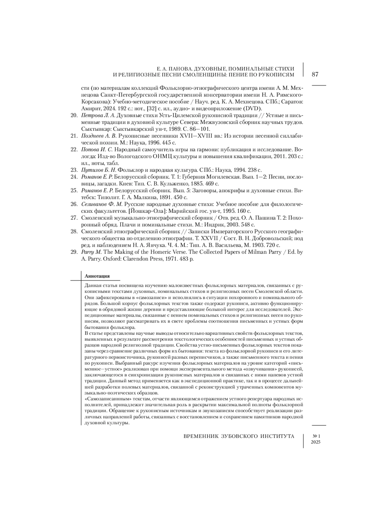19. Панова Е. А., Теплова И. Б. Звучащие рукописи: духовные, поминальные стихи и религиозные песни на страницах рукописных тетрадей народных исполнителей Смоленской области (по материалам коллекций Фольклорно-этнографического центра имени А. М. Мехнецова Санкт-Петербургской государственной консерватории имени Н. А. Римского-Корсакова): Учебно-методическое пособие / Науч. ред. К. А. Мехнецова. СПб.; Саратов: Амирит, 2024. 192 с.: нот., [32] с. ил., аудио- и видеоприложение (DVD). EDN: QPWIZO