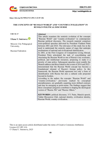 В статье анализируется процесс семиотического развития понятий «Русский мир» и «страна-цивилизация» в российском политическом дискурсе. Материалом исследования служат общественно-политические выступления