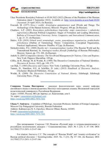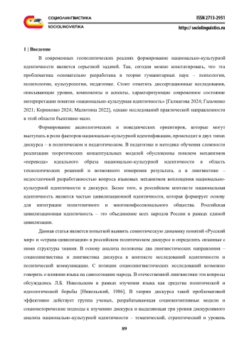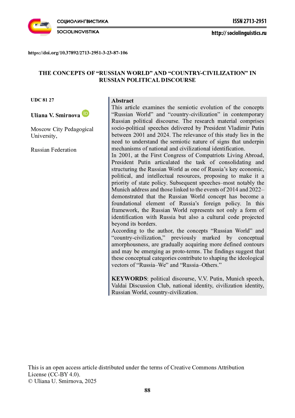 В 2001 годом на I Конгрессе зарубежных соотечественников президент В. В. Путин объявил о задаче консолидации и структурирования «Русского мира» как важнейшего экономического, политического и интеллектуального ресурса России и предложил считать эту инициативу одним из приоритетов государственной политики. Далее прозвучала Мюнхенская речь, обращения президента в связи с событиями 2014 года и 2022 года, когда стало понятно, что концепция Русского мира лежит в основе внешнеполитических действий России, где Русский мир - это не только отождествление с Россией, но и культурный код, развернутый вовне. По мнению автора статьи, понятия «Русский мир» и «страна-цивилизация», ранее имевшие аморфное концептуальное состояние, постепенно приобретают более строгие определения и, возможно, начинают функционировать как прототермины. Исследование позволяет сделать вывод о том, что эти концептуальные понятия участвуют в формировании идеологических векторов «Россия - мы» и «Россия - другие».
