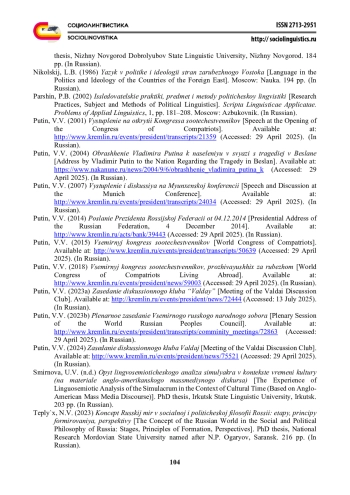 В. В. Путина в период 2001-2024 гг. Актуальность работы обусловлена необходимостью осмысления семиотической природы знаков, связанных с механизмами национально-культурной и цивилизационной идентификации.