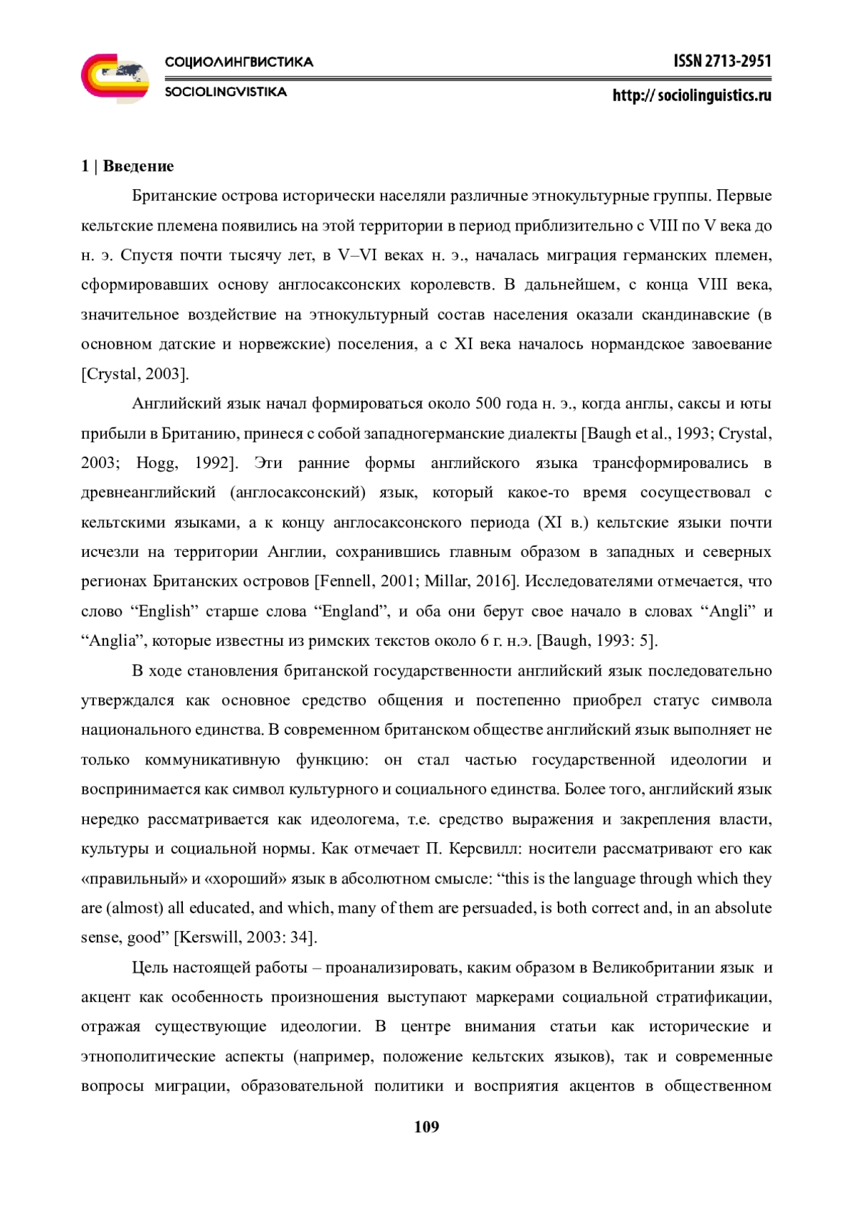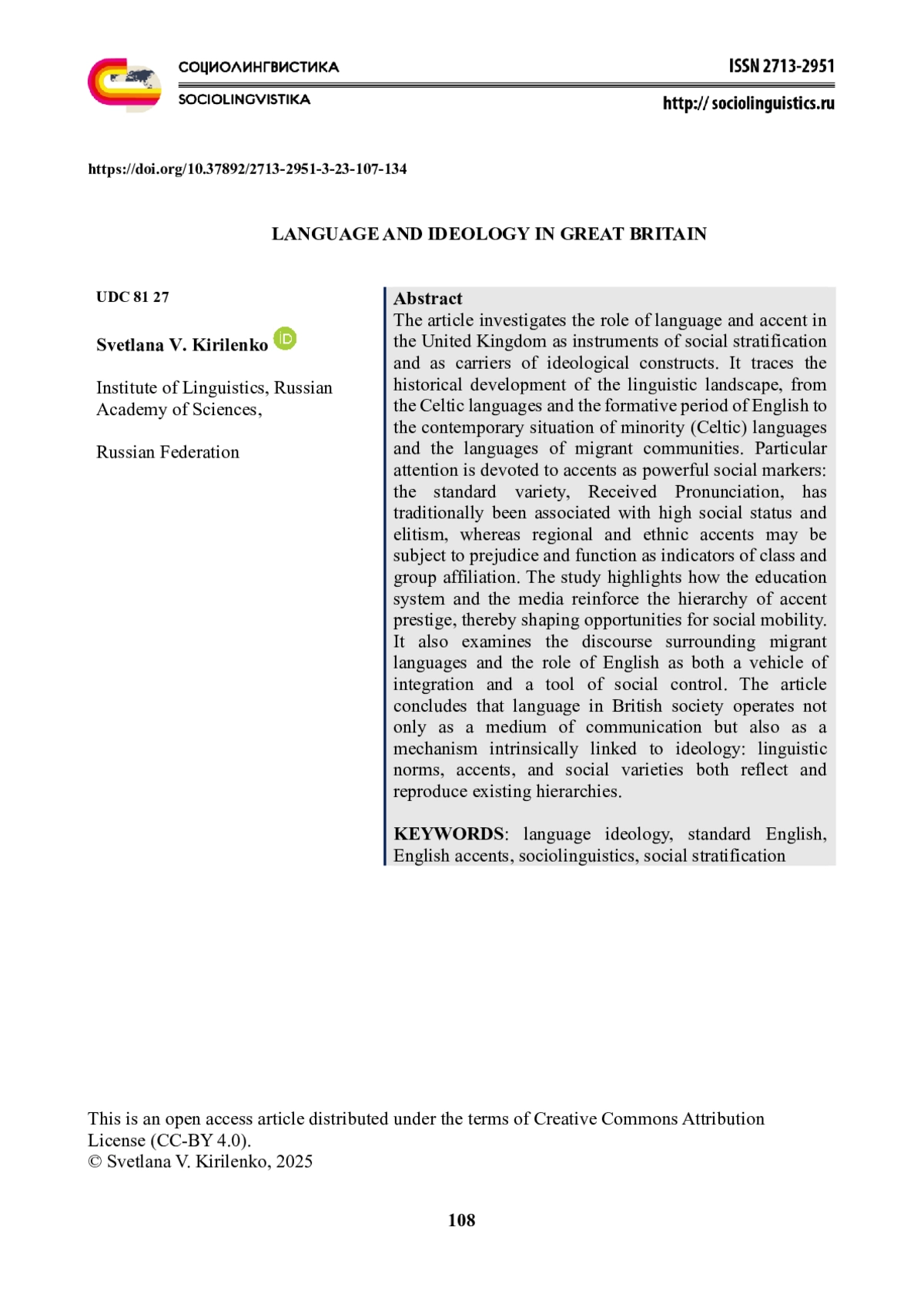 Статья посвящена исследованию роли языка и акцента в Великобритании как инструментов социальной стратификации и носителей идеологических установок. Рассматривается историческое развитие языкового ландшафта начиная с кельтских языков и периода становления английского; а также анализируется современное положение миноритарных (кельтских) языков и языков мигрантских сообществ. Особое внимание уделено акцентам как социальным маркерам стандартный вариант (Received Pronunciation) традиционно ассоциируется с высоким социальным статусом и элитарностью, в то время как региональные и этнические акценты могут вызывать предвзятое отношение и служить индикаторами принадлежности к определенным социальным слоям. В статье отмечается, что образовательная система, а также и СМИ поддерживают иерархию престижности акцентов, что напрямую влияет на социальную мобильность. Отдельно анализируется дискурс по отношению к языкам мигрантов и роли английского языка как средства интеграции и контроля. Делается вывод о том, что язык в британском обществе функционирует не только как средство коммуникации, он напрямую связан с существующими идеологиями языковые нормы, акценты, социальные варианты языка отражают и воспроизводят существующие иерархии.