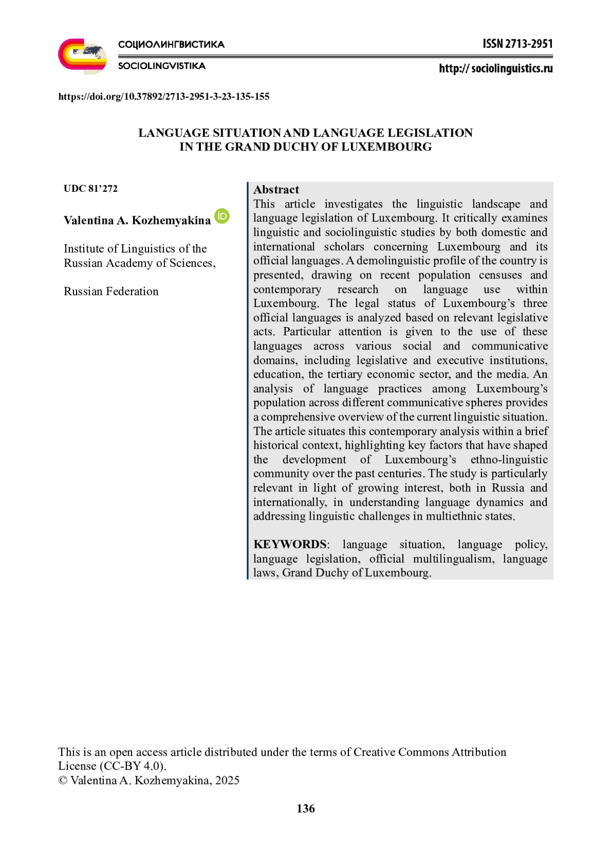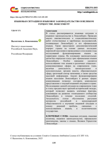 В статье рассматриваются языковая ситуация и языковое законодательство в Люксембурге. Проведен анализ лингвистических и социолингвистических работ отечественных и зарубежных исследователей, посвященных Люксембургу и его официальным языкам. Также представлен демолингвистический портрет страны на основе данных последних переписей населения и проведенных в последние годы исследований функционирования языков на территории страны. На основании законодательных актов был определен статус трех официальных языков Люксембурга. Особое внимание уделяется использованию этих языков в различных социально-коммуникативных сферах на современном этапе, включая деятельность законодательных и исполнительных органов власти, образовательную сферу, третичный сектор экономики, а также средства массовой информации. Анализ функционирования языков населения Люксембурга в разных сферах коммуникации позволил составить комплексное представление о текущей языковой ситуации в стране. Исследованию данной ситуации на современном этапе в статье предшествует краткий исторический экскурс, который позволяет выявить ключевые факторы, повлиявшие на развитие этноязыкового сообщества Люксембурга в течение последних столетий. Актуальность статьи обусловлена растущим интересом российской и международной общественности к изучению языковой ситуации и поиску решений проблем, связанных с использованием языков, в полиэтнических государствах.