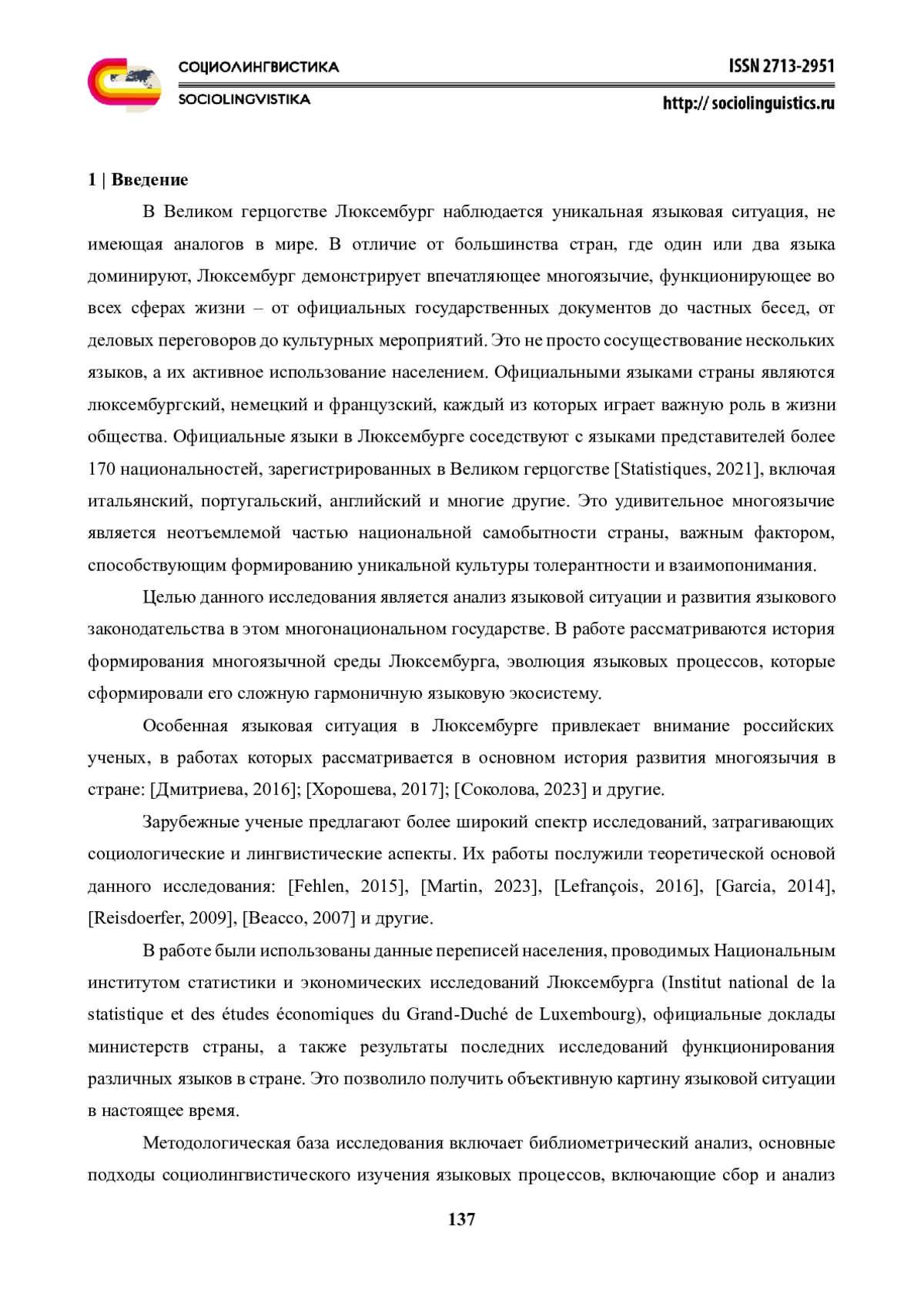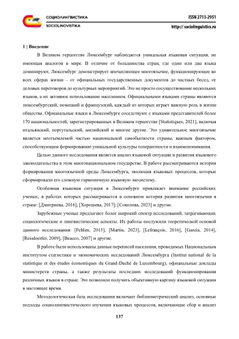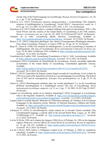 2. Соколова Г.А. (2023) Языковая ситуация многоязычия в Люксембурге, Вестник МГЛУ. Гуманитарные науки. № 3 (871). С. 110-114. EDN: ASWMMN