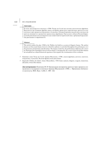 В статье анализируется спектакль «1789» Театра дю Солей как система диегетических фреймов. Выделяется три основных фрейма, между которыми происходит переключение зрителя по ходу спектакля через процессы погружения и очуждения. Основной принцип воздействия спектакля на зрителя связывается с размытием границ между фреймами. В результате события Великой французской революции актуализируются как совместный исторический опыт, требующий продолжения революции в современности.
