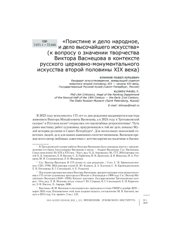 Церковные росписи Виктора Васнецова, принесшие ему при жизни наибольшую славу, обычно рассматриваются в контексте русского монументального искусства рубежа XIX-XX веков, а также творчества последователей и младших современников художника. В данной статье наследие Васнецова-монументалиста исследуется в связи с проблематикой монументальной живописи второй половины XIX века, связанной с академическими и реалистическими традициями. Это помогает глубже понять генезис «васнецовского стиля» и особенности его восприятия критикой.