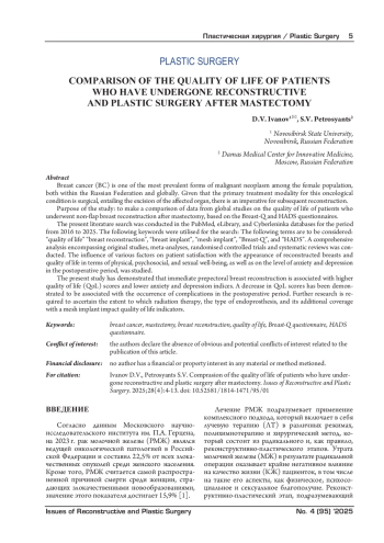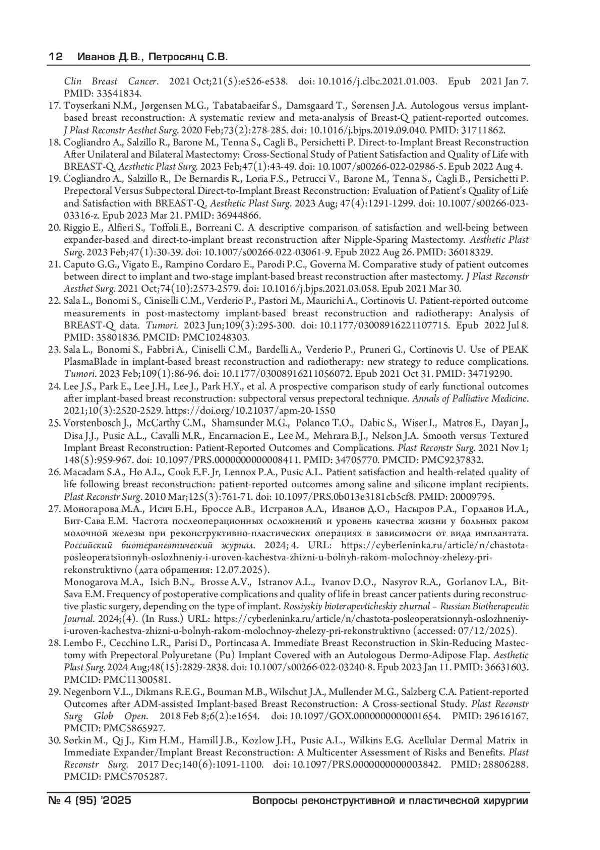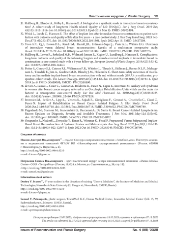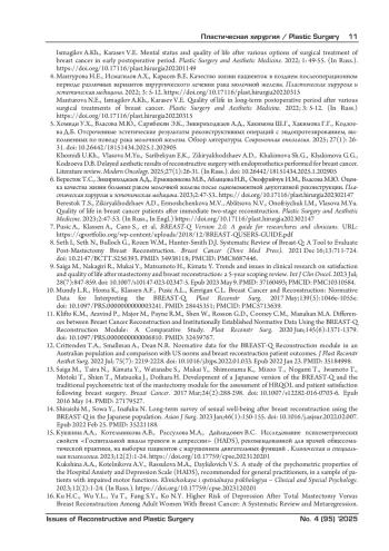 4. Мантурова Н.Е., Исмагилов А.Х., Карасев В.Е. Качество жизни пациенток в позднем послеоперационном периоде различных вариантов хирургического лечения рака молочной железы. Пластическая хирургия и эстетическая медицина. 2022; 3: 5-12. DOI: 10.17116/plast.hirurgia20220315