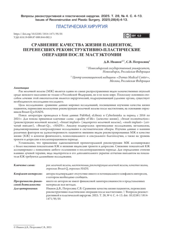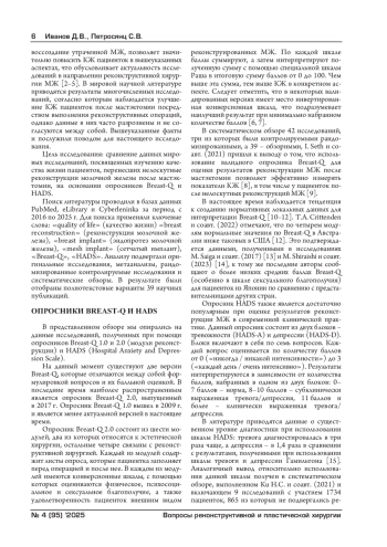 Поиск литературы проводился в базах данных PubMed, eLibrary и Cyberleninka за период с 2016 по 2025 г. Для поиска применяли ключевые слова: «quality of life» (качество жизни), «breast reconstruction» (реконструкция молочной железы), «breast implant» (эндопротез молочной железы), «mesh implant» (сетчатый имплант), «Breast-Q», «HADS». Анализу подвергались оригинальные исследования, метаанализы, рандомизированные контролируемые исследования и систематические обзоры. Изучены данные о влиянии различных факторов на удовлетворенность пациенток внешним видом реконструированных МЖ и качество жизни (КЖ) в аспектах физического, психосоциального и сексуального благополучия, а также на уровень тревоги и депрессии в послеоперационном периоде.