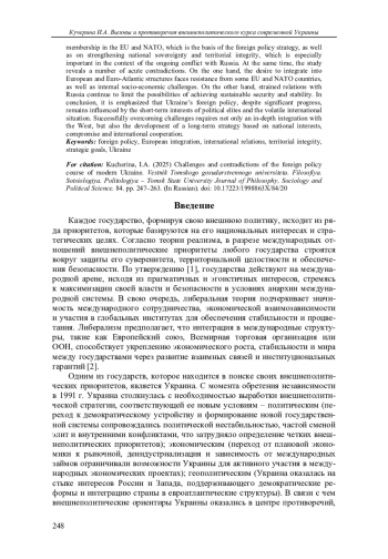 Рассматриваются ключевые вызовы и противоречия внешнеполитического курса современной Украины. Анализируются внутренние и внешние факторы, оказывающие влияние на формирование внешнеполитической стратегии страны. Особое внимание уделяется динамике взаимоотношений Украины с Европейским союзом, НАТО, Россией и другими ключевыми международными акторами. Выявляются возможные пути преодоления вызовов, включая сбалансированный подход к внешнеполитическим приоритетам, восстановление диалога с Россией и активизацию международного сотрудничества. Предлагается комплексная стратегия, направленная на достижение стабильности, укрепление суверенитета и обеспечение устойчивого развития Украины в условиях сложной международной обстановки.