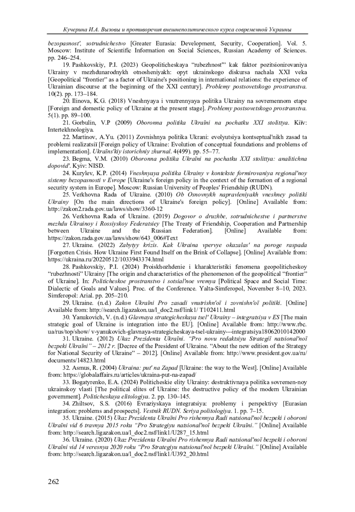 19. Пашковский П.И. Геополитическая “рубежность” как фактор позиционирования Украины в международных отношениях: опыт украинского дискурса начала XXI века // Проблемы постсоветского пространства. 2023. № 10 (2). С. 173-184. EDN: TOTPZC