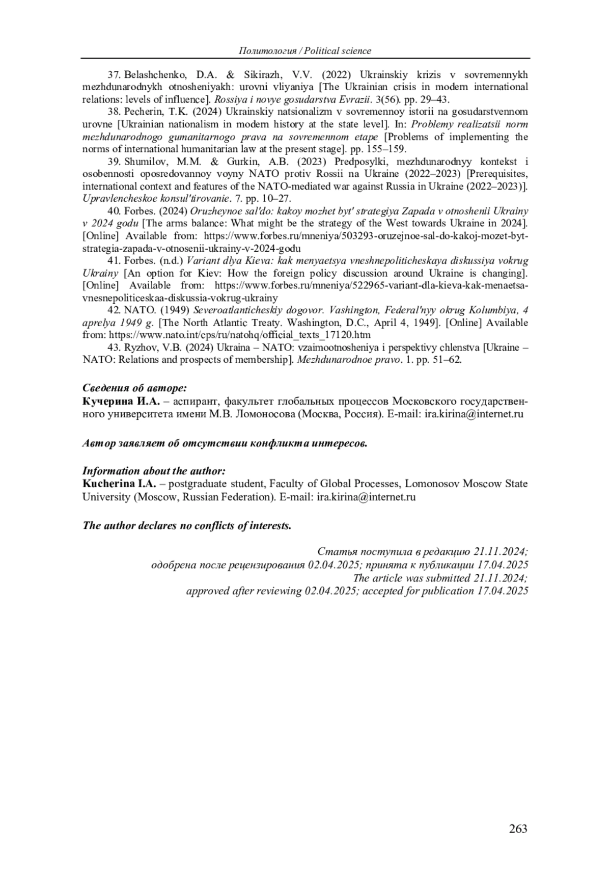 39. Шумилов М.М., Гуркин А.Б. Предпосылки, международный контекст и особенности опосредованной войны НАТО против России на Украине (2022-2023) // Управленческое консультирование. 2023. № 7. С. 10-27. EDN: PSSPNY
