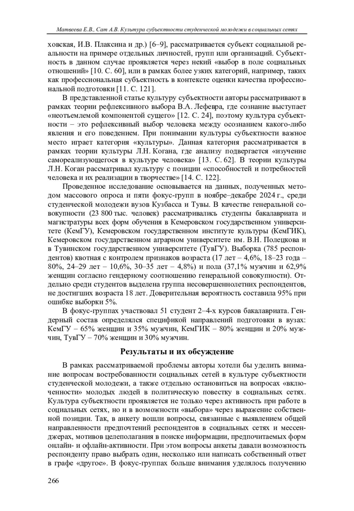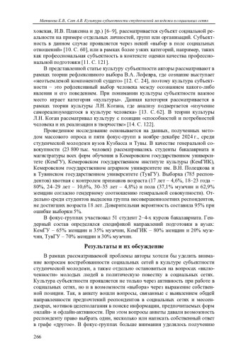 Приводятся результаты социологических исследований, проведенных среди вузовской молодежи Кемеровской области - Кузбасса и Республики Тыва. При интерпретации результатов исследований авторы основываются на теории рефлексивного выбора В. А. Лефевра и теории культуры Л. Н. Когана, что позволяет рассматривать культуру субъектности студенческой молодежи в социальных сетях через призму потребностей человека.