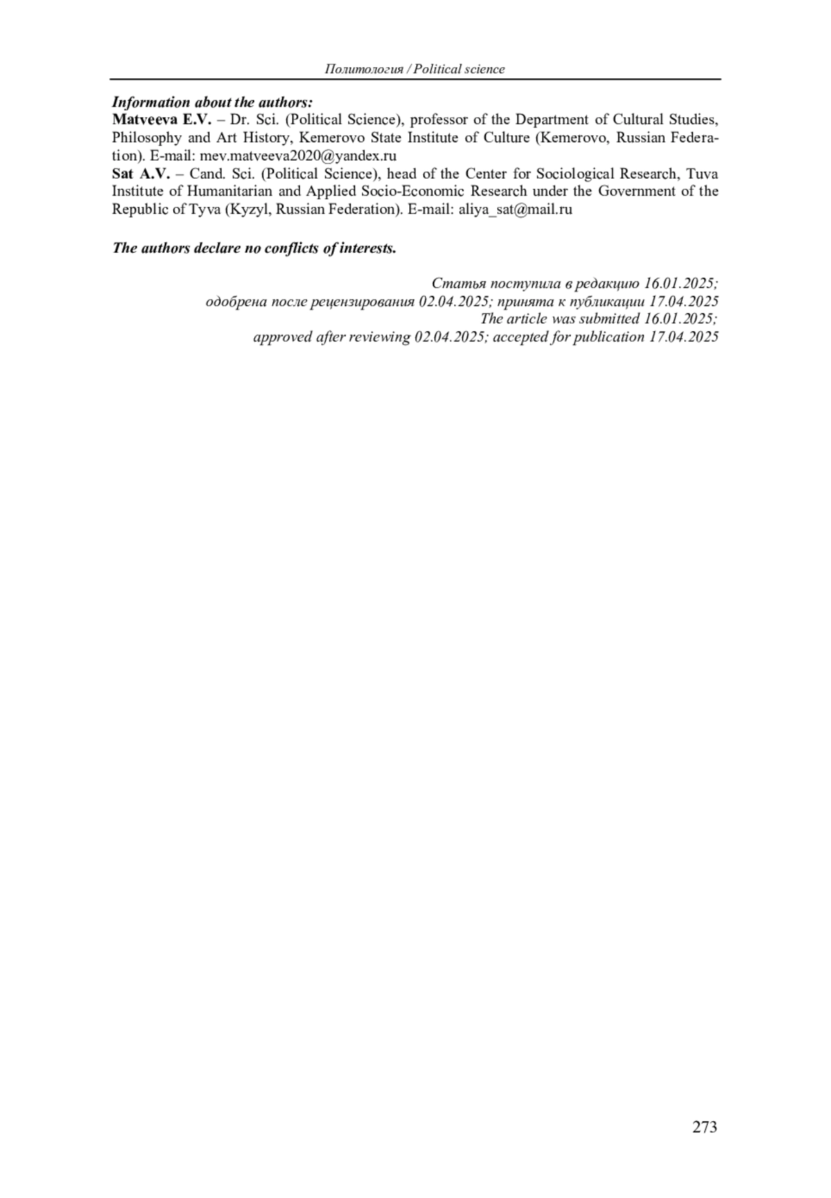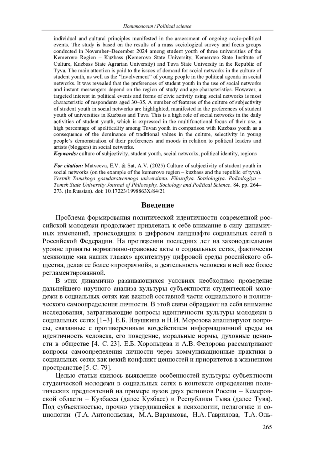 15. Матвеева Е.В., Сат А.В. Политическая культура избирателей Республики Тыва как индикатор отношений власти и общества (по результатам социологических исследований) // Вестник Томского государственного университета. 2022. № 476. С. 159-167. DOI: 10.17223/15617793/476/17 EDN: LLWOGH