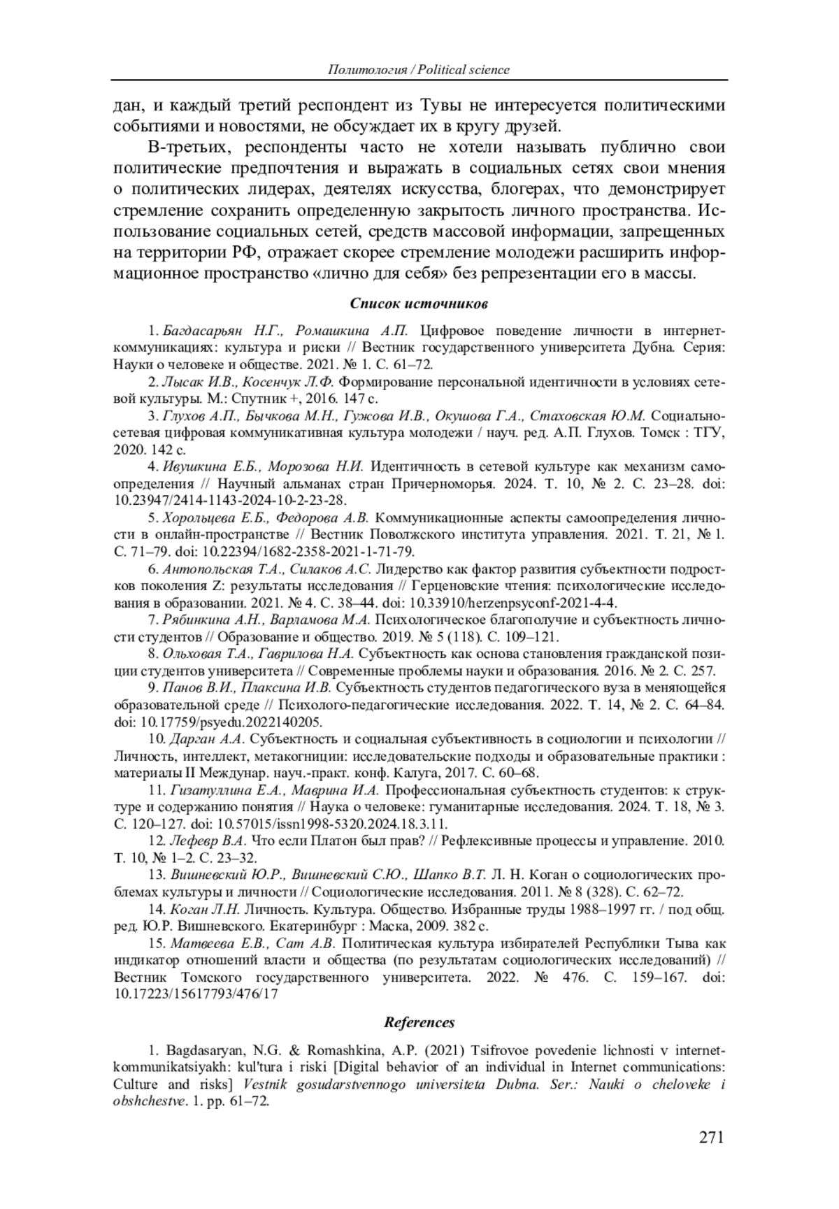 1. Багдасарьян Н.Г., Ромашкина А.П. Цифровое поведение личности в интернет-коммуникациях: культура и риски // Вестник государственного университета Дубна. Серия: Науки о человеке и обществе. 2021. № 1. С. 61-72. EDN: MIVEDN