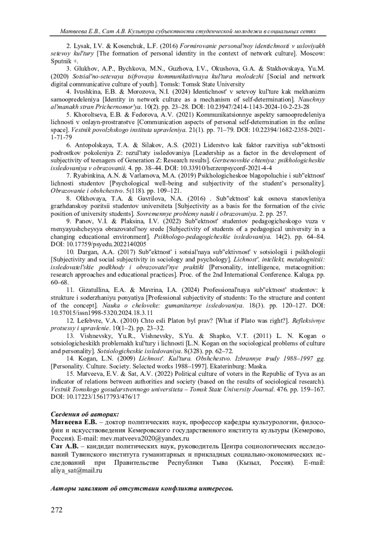 5. Хорольцева Е.Б., Федорова А.В. Коммуникационные аспекты самоопределения личности в онлайн-пространстве // Вестник Поволжского института управления. 2021. Т. 21, № 1. С. 71-79. DOI: 10.22394/1682-2358-2021-1-71-79 EDN: XLHOCD