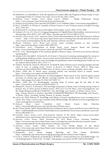 61. Омиди З., Куша М., Назери Н., Хосрави Н., Омиди М. Состояние стратегий и показателей скрининга рака молочной железы в Иране: обзорный анализ. Journal of Research in Medical Sciences, 2022; 27. https://journals.lww.com/jrms/fulltext/2022/27000/status_of_breast_cancer_screening_strategies_and.21.aspx.