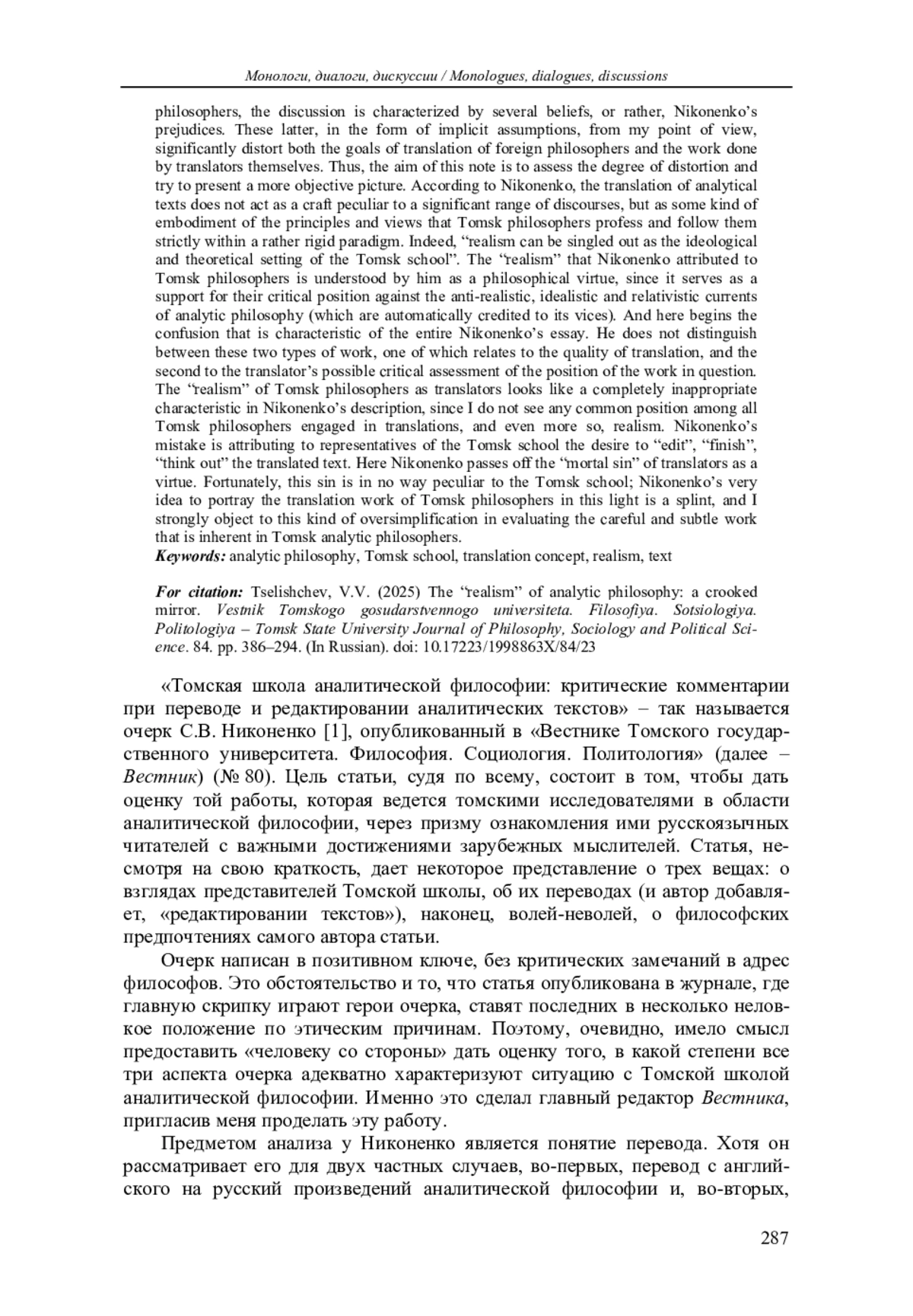 Предметом статьи является критика концепции перевода аналитических текстов, представленная С. Никоненко в определения институциональных и теоретических контуров Томской школы. Показано, что предлагаемая им реконструкция дискурса и методологии работы с аналитическими текстами содержит серьезные фактологические ошибки, осложненные подменой концепции перевода с собственно философскими взглядами переводчика. Опровергается взгляд на перевод философских текстов как на процесс, подразумевающий «правку», «дописывание» и «додумывание» за автора переводимого текста. Показывается, что приписывание подобных установок является сверхупрощением в оценке тщательной и тонкой работы, которая присуща томским аналитическим философам.