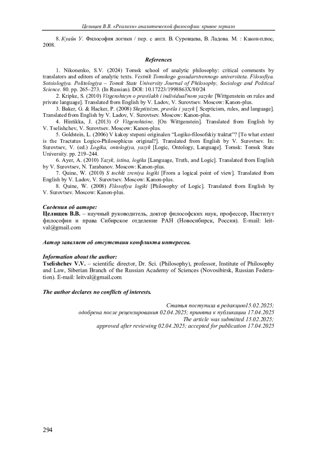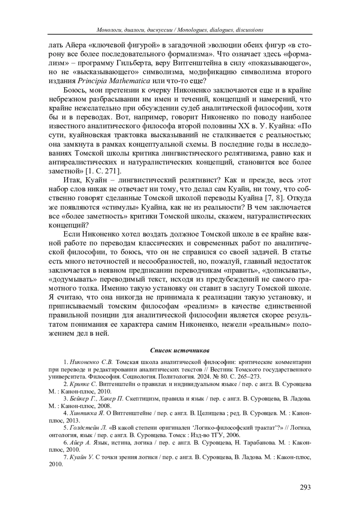 1. Никоненко С.В. Томская школа аналитической философии: критические комментарии при переводе и редактировании аналитических текстов // Вестник Томского государственного университета. Философия. Социология. Политология. 2024. № 80. C. 265-273. EDN: OBQCOT