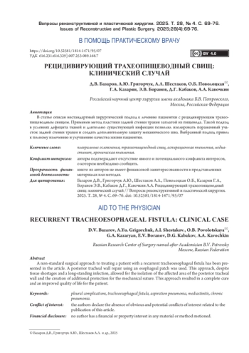 Трахеопищеводный свищ является опасным жизнеугрожающим поражением дыхательных путей, приводя к астенизации пациента, аспирационной пневмонии и сепсису. Ранняя диагностика данной патологии и выбор правильной хирургической тактики в каждом конкретном случае являются решающими факторами для успешного лечения таких больных, сохранения их жизни. Тяжелое состояние пациентов в момент манифестации свища не позволяет выполнить операцию в острой фазе, поэтому хирургическое лечение проводится в отсроченном периоде. Тем не менее, даже после соответствующей подготовки и радикально выполненного вмешательства частота рецидивов свища варьирует в пределах от 1,9 до 25,0% [1, 2]. Трахеопищеводные свищи средне- и нижнегрудной локализации, особенно в случаях развития рецидива, представляют наибольшую угрозу для жизни пациентов и являются настоящим вызовом для хирурга [2].