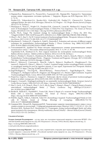 6. Паршин В.Д., Вишневская Г.А., Русаков М.А., Гудовский Л.М., Паршин В.В., Чернова Е.А. Трахеопищеводные свищи: современное состояние проблемы // Хирургия. Журнал им. Н.И. Пирогова. 2013. Т. 2. С. 73-79.