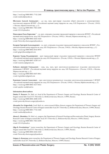 Заключение. Оперативные вмешательства у пациентов с опухолями средостения высоко эффективны, имеют низкую частоту интра- и послеоперационных осложнений и летальность. При планировании операции предпочтение следует отдавать видеоэндоскопическим методам – малотравматичным, имеющим меньшую продолжительность и высокую радикальность, сравнимую с открытыми операциями. При невозможности видеоэндоскопического вмешательства может быть рассмотрен вариант открытой операции, в том числе с расширением объема при врастании опухоли в легочную ткань, сосуды и перикард. Циторедуктивные варианты операций применимы в случаях больших размеров опухоли для уменьшения ее объема, устранения компрессии трахеи, бронхов, сосудов и проведения дальнейшего лечения (химио-, лучевая